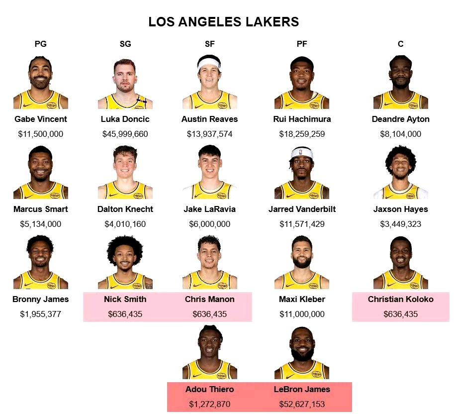 一晃詹姆斯加盟湖人已有8年了,他的年薪已涨到5267万美元,队内第一。 在裁掉4名训练营合同的球员后,湖人阵容总共17人:3人双向合同(小尼克·史密斯,克里斯·马农,科洛科)和14人正式合同。 詹姆斯和蒂耶罗正在伤病恢复期。