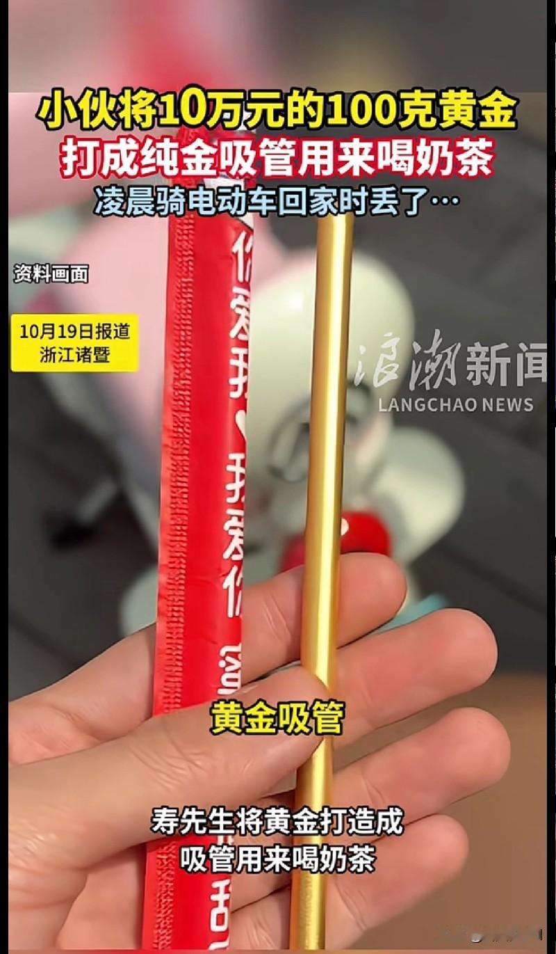 “家人们快来看这操作!浙江一哥们把10万元的100克黄金打成吸管,就为了喝奶茶!结果凌晨骑电动车回家时,这‘金吸管’居然丢了… 咱就是说,用黄金吸管喝奶茶,这是奶茶里泡了金箔吗?还是喝的不是奶茶是‘金汤’啊!10万块就这么变成一根吸管,现在还丢了,这哥们得多心疼啊! 网友们都炸了:‘这哪是喝奶茶,这是喝金子啊!’‘丢了的话,捡到的人怕是以为捡到了金箍棒吧!’ 不得不说,这操作也太‘豪横’了,就是代价有点大,希望他能赶紧找到,不然这奶茶喝得也太贵了!”