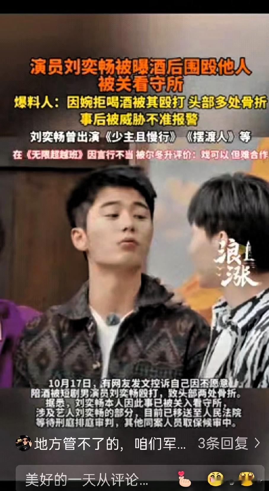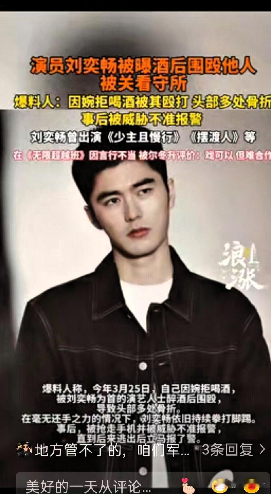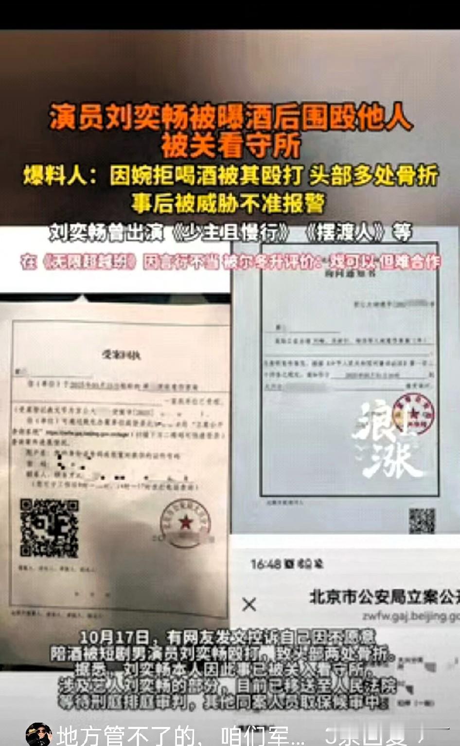 明星众人殴打现役军人 事后进派出所竟然集体串供 28岁演员刘奕畅的操作,看完只剩愤怒!不过是饭局上现役军人婉拒陪酒,他竟当场动了恶念,喊人把军人围得水泄不通,拿起洋酒瓶就往对方头上砸,碎瓶片还想捅人,硬生生把人打得头部两处骨折,差点窒息,下手狠得毫无顾忌! 更气人的是,抢了军人手机威胁不准声张,转头就建群教唆同伙串供,编造“互殴”“情感矛盾”的谎话,连女友都被拉来帮忙销毁证据,全程没把法律和他人生命放在眼里,嚣张得离谱! 最让人不齿的是他的“两面派”嘴脸:这边刚把保家卫国的军人打进医院,那边就能上综艺装模作样谈“艺德”,说什么“艺人要坚守底线”;到了八一建军节,还凑热度发动态致敬军人,一边伤害军人,一边消费军人情怀,虚伪得让人恶心! 真以为有点名气就手握特权?真觉得军人的尊严可以随意践踏?现在好了,他被关看守所等待审判,代言权解约,新剧直接下架,从光鲜演员变成阶下囚,这就是违法失德的必然结果! 明星光环从来护不住违法的人,军人的荣誉更是碰不得的底线!
