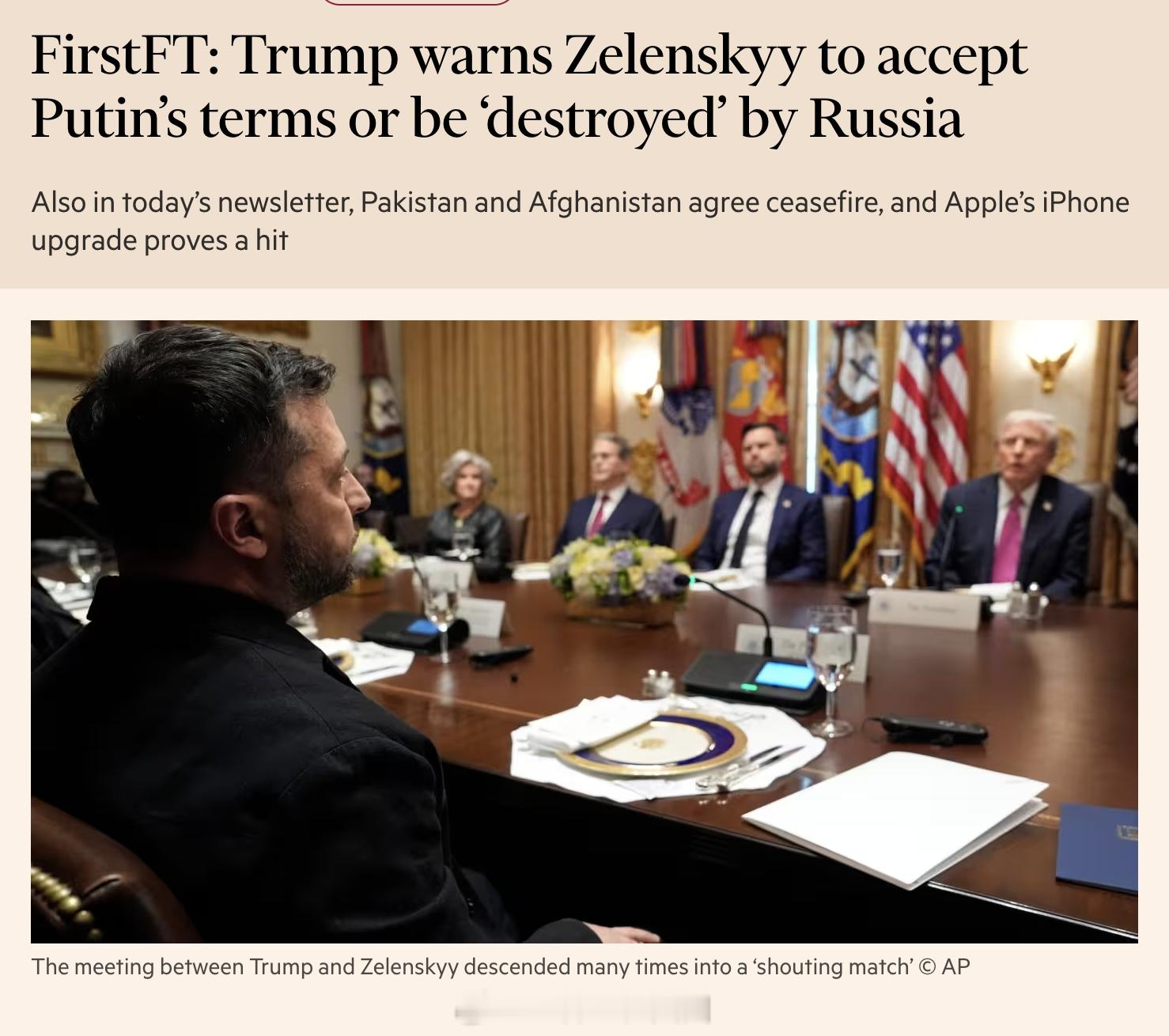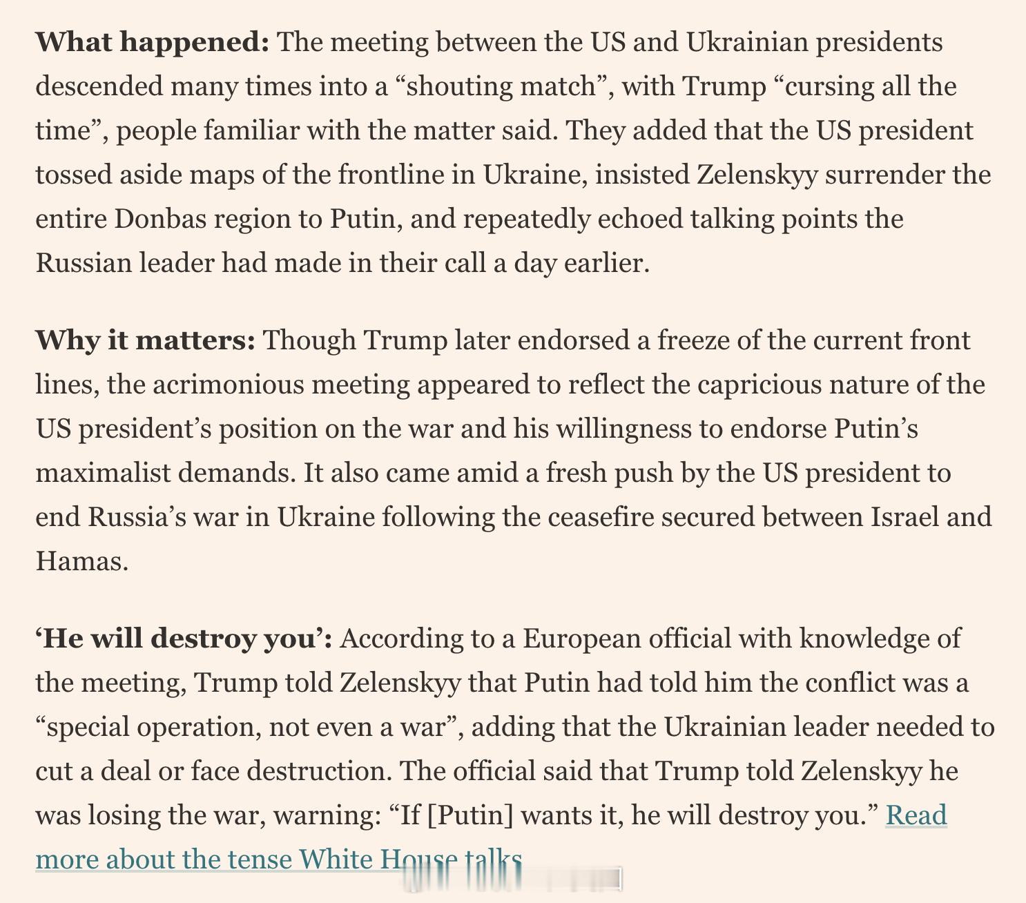 一位了解这场会谈的欧洲官员透露,川普告诉泽连斯基,普京向他解释这场冲突只是“一次特别行动,不算战争”,并补充说乌克兰领导人必须达成协议,否则就要面临毁灭。