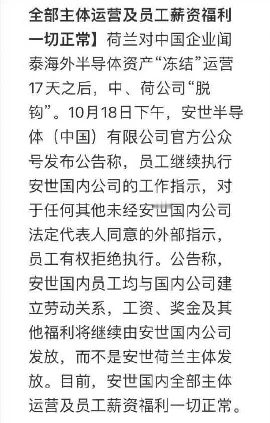 安世中国这波操作算是把主动权攥在自己手里了,10 月 18 日下午直接发声明跟荷兰安世切割,还特意强调工资照发,这事儿办得通透,一点毛病没有。要是仔细捋捋前因后果就知道,这根本不是临时起意的仓促决定,而是闻泰科技早有准备的精准应对。 首先得把这几家公司的关系掰扯明白,不然容易绕晕。咱们说的荷兰安世,全名叫安世半导体,总部在荷兰奈梅亨,以前是恩智浦的标准产品事业部,后来被闻泰科技花了三年时间拿下了 100% 的股权,是实打实的全资子公司。 而安世中国呢,虽然表面上看着是直接受荷兰安世领导,但它本质上是扎根中国的独立运营主体,有自己的法人资格。这层关系就很关键,为后来的切割埋下了伏笔。 那好好的荷兰安世怎么就被 "抢走" 了?说穿了还是地缘政治闹的,幕后推手其实是美国。早在 2024 年 12 月,闻泰科技就被美国列进了 "实体清单",到了 2025 年 9 月,美国又把清单扩大到控股 50% 以上的子公司,安世半导体直接躺枪。 美国还逼着荷兰政府给安世换 CEO,说不换掉就别想拿豁免资格。荷兰政府一边怕被美国拉黑名单,一边想强化所谓的 "欧洲属性",干脆就动了手。 9 月 30 日荷兰经济事务部先下了部长令,把安世全球 30 个主体的资产、人员全都冻结了,有效期一年。紧接着 10 月 1 日,荷兰安世的三个外籍高管突然发难,向当地法庭提交紧急申请,没等开庭就先把CEO 职务给暂停了,还把闻泰持有的股份(就留了 1 股)托管给了第三方。 10 月 7 日法庭裁决下来,更是直接派了个外籍董事来掌决策权,等于闻泰暂时丢了管理权,虽说经济收益权还在,但控制权确实被架空了。这一系列操作下来,明摆着是借着 "国家安全" 的由头,硬抢中资的资产。 但荷兰政府千算万算,漏了安世中国这个关键角色。他们可能以为冻结了全球主体就能一网打尽,却忘了安世中国是受中国法律管辖的独立法人。安世中国在声明里说得很明白,公司有独立的法人人格,法定代表人说了算,任何人不能滥用权利损害公司利益。 闻泰科技这步棋走得也够稳。早在荷兰动手初期,公司就发声明坚决反对商业政治化,说荷兰是 "过度干预",还点出那些外籍高管是 "借政治压力夺权"。一边找国际律所准备法律救济,一边对接政府部门争取支持,同时还稳住了供应商和客户,生产销售没断档。 现在安世中国站出来切割,其实就是把之前的准备落到了实处 —— 既然荷兰安世被托管了,那干脆就让安世中国彻底独立,把核心资产和业务保住。 有人可能担心切割后安世中国能不能活下去,其实完全不用慌。安世半导体本身就是全球顶尖的标准器件供应商,安世中国在国内有完整的生产和销售体系,客户涵盖汽车、消费电子这些刚需领域。 闻泰收购安世后,把它打理得相当不错,2022 年营收冲到 23.6 亿欧元,毛利率从 25% 涨到 42.4%,到 2024 年都还清债务零负债运行了。安世中国手里有技术有客户,再加上闻泰在背后撑腰,别说工资照发了,正常运营都没啥问题。 这事儿还戳破了荷兰和美国的小算盘。他们想通过控制荷兰安世来卡中国半导体的脖子,但安世中国一独立,这套打法就落了空。中国半导体行业协会也站出来发声,说这是歧视性限制,破坏了全球产业链生态。毕竟半导体产业靠的是全球化协作,不是谁想切割就能切割的。 现在来看,安世中国的切割不光是自保,更是给所有海外布局的中企提了个醒。只要牢牢抓住 "独立法人人格" 这个关键点,提前做好资产隔离的准备,就算遇到地缘政治的风浪,也能有底气站稳脚跟。 闻泰科技这波操作,既没丢面子也保了里子,接下来就看荷兰那边怎么收场了,毕竟股权所有权还在闻泰手里,真要打官司,未必输。