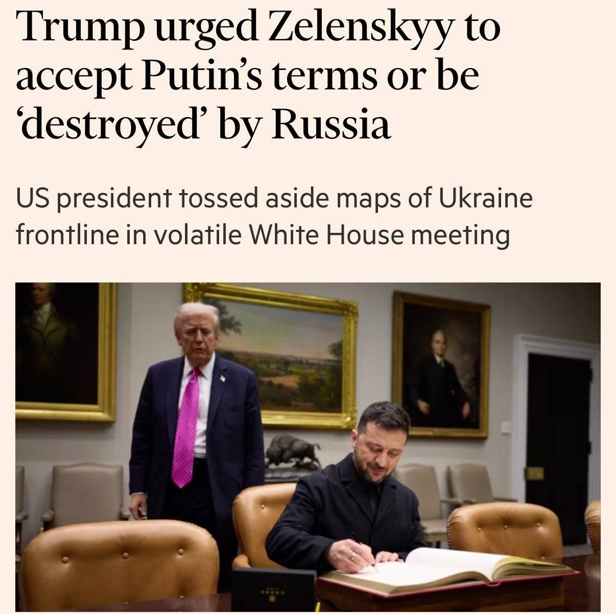 《金融时报》报道,特朗普本周的会议中,呼籲泽连斯基接受俄俄停止战争的条件。据称,他警告说,在谈话中普京威胁称,如果乌克兰不同意,他将“摧毀乌克兰”。