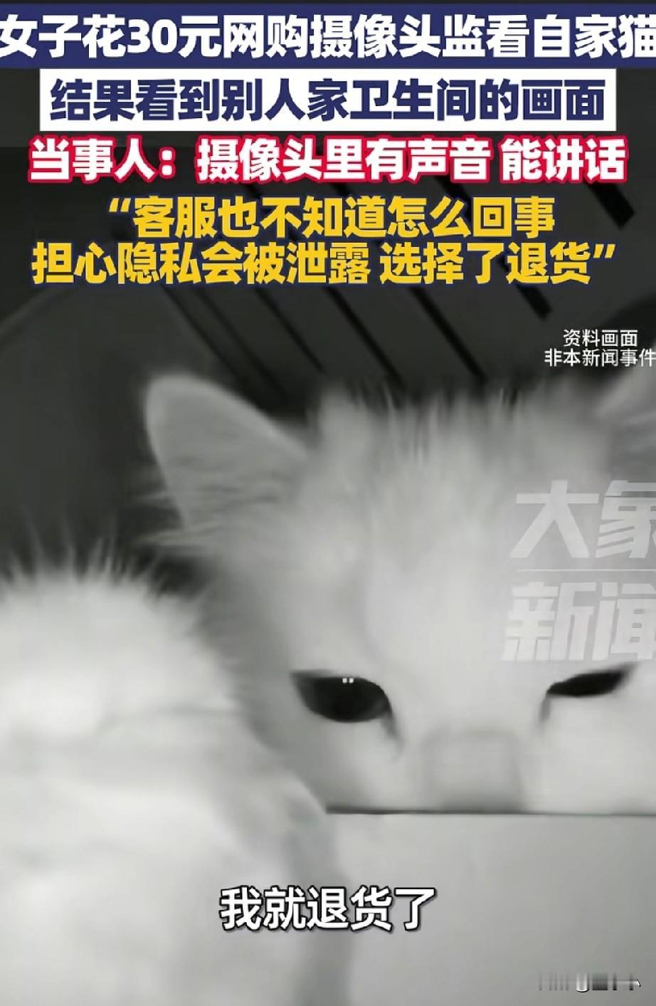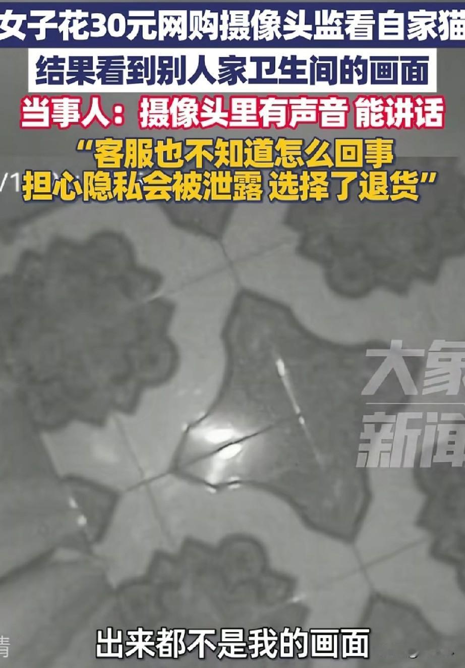 广东一女子网购摄像头, 给所有的人提了一个醒! 不管你选择什么品牌的东西,还是要小心谨慎为好! 女子花了30元网购一个摄像头,想要看自家的猫咪,在调制的时候不仅看不到自家的画面,反而看到的是别人家里的画面,画面中还清晰的能听到有人对话声音。 其实, 摄像头安家里也就相当于把别人的眼睛搬进家里一个道理,如果你这边能看到别人,那别人也能看到你这边。 真的要装摄像头的话,我到觉得只能放门口,客厅这些地方,像睡觉的地方还是算了吧!