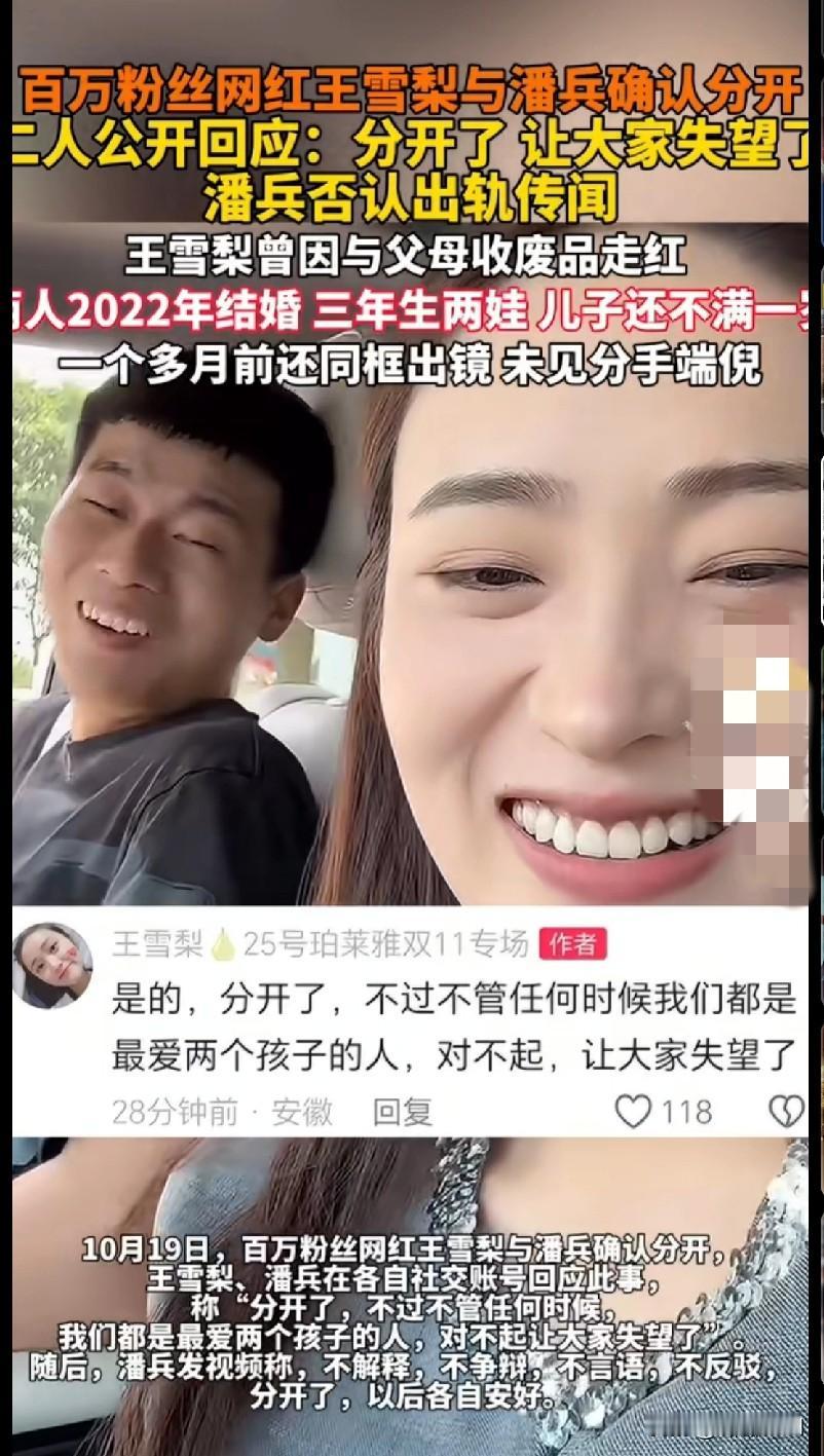 “百万粉丝网红王雪梨和潘兵官宣分开了!俩人还道歉说‘让大家失望了’,潘兵也否认了出轨传闻。 他俩2022年结婚,三年生俩娃,小儿子还不到一岁呢。一个多月前还同框拍视频,谁能想到说分就分了。 网友们都懵了,毕竟之前看他们带娃收废品的日常,还觉得挺接地气挺恩爱的。现在突然分开,确实让人唏嘘。 不过不管咋样,希望他俩以后都好好的,尤其是俩孩子能健康长大。咱普通人看看热闹就好,也祝大家感情都顺顺利利的!”