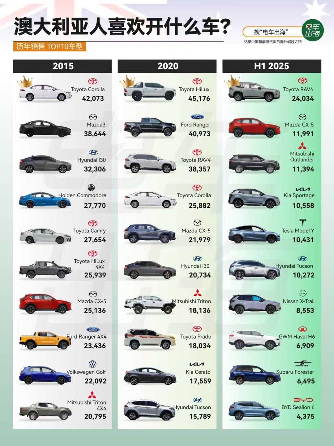 十年前,街头最常见的是丰田卡罗拉、马自达3和现代i30,家用小车占据主导。可到2020年,风向开始转:皮卡和SUV悄悄爬上榜单——丰田HiLux、福特Ranger、丰田RAV4轮番登场。
