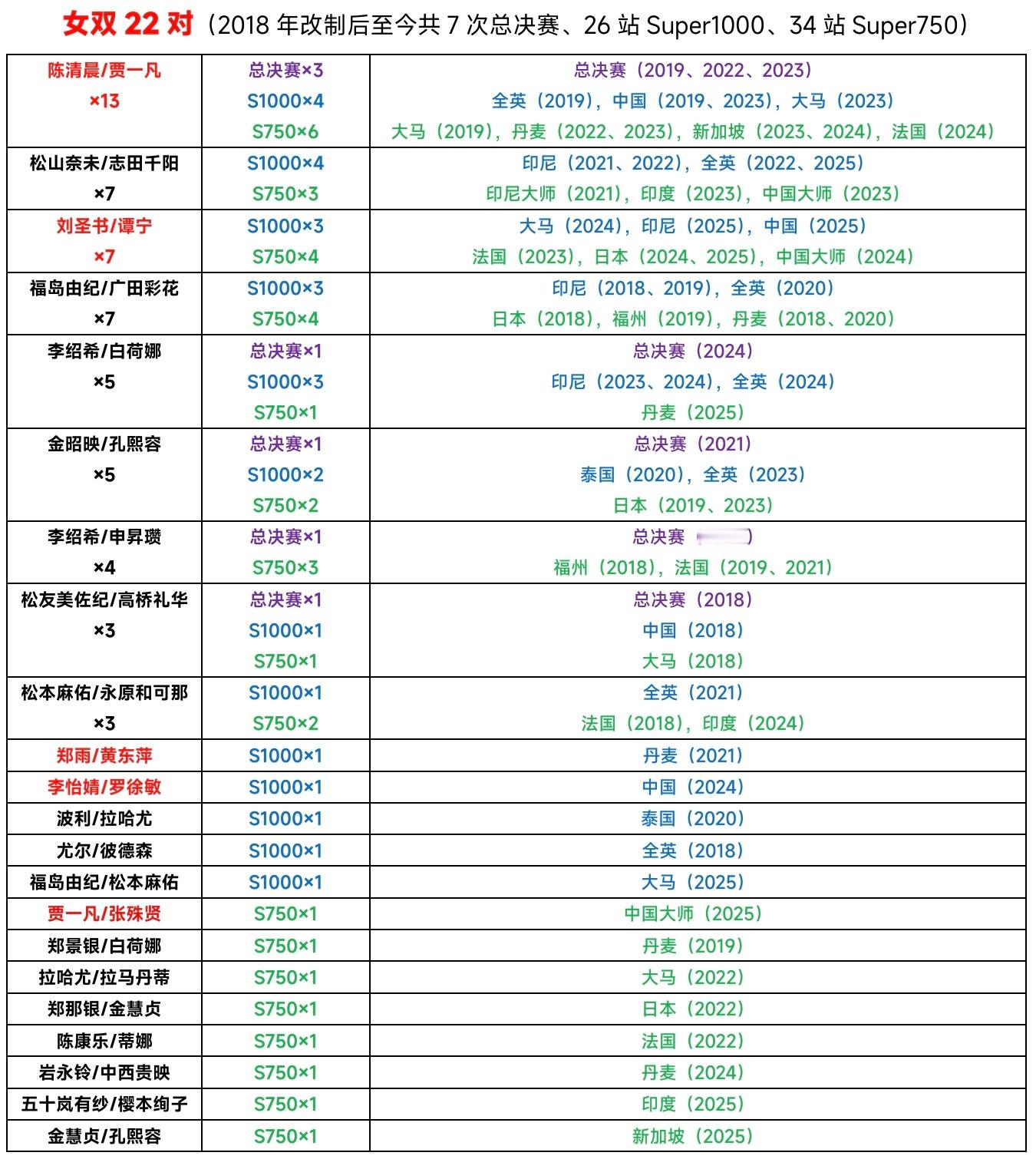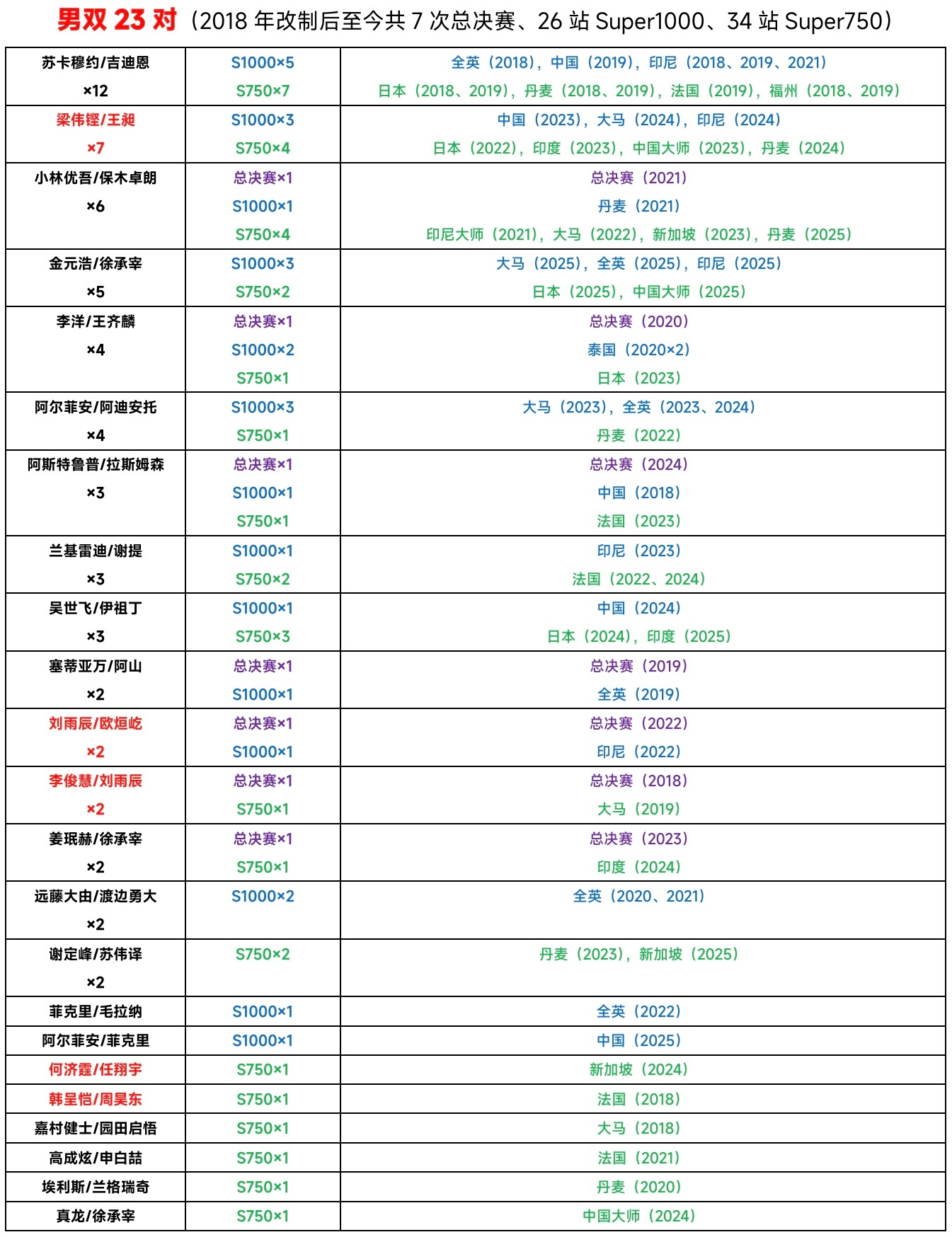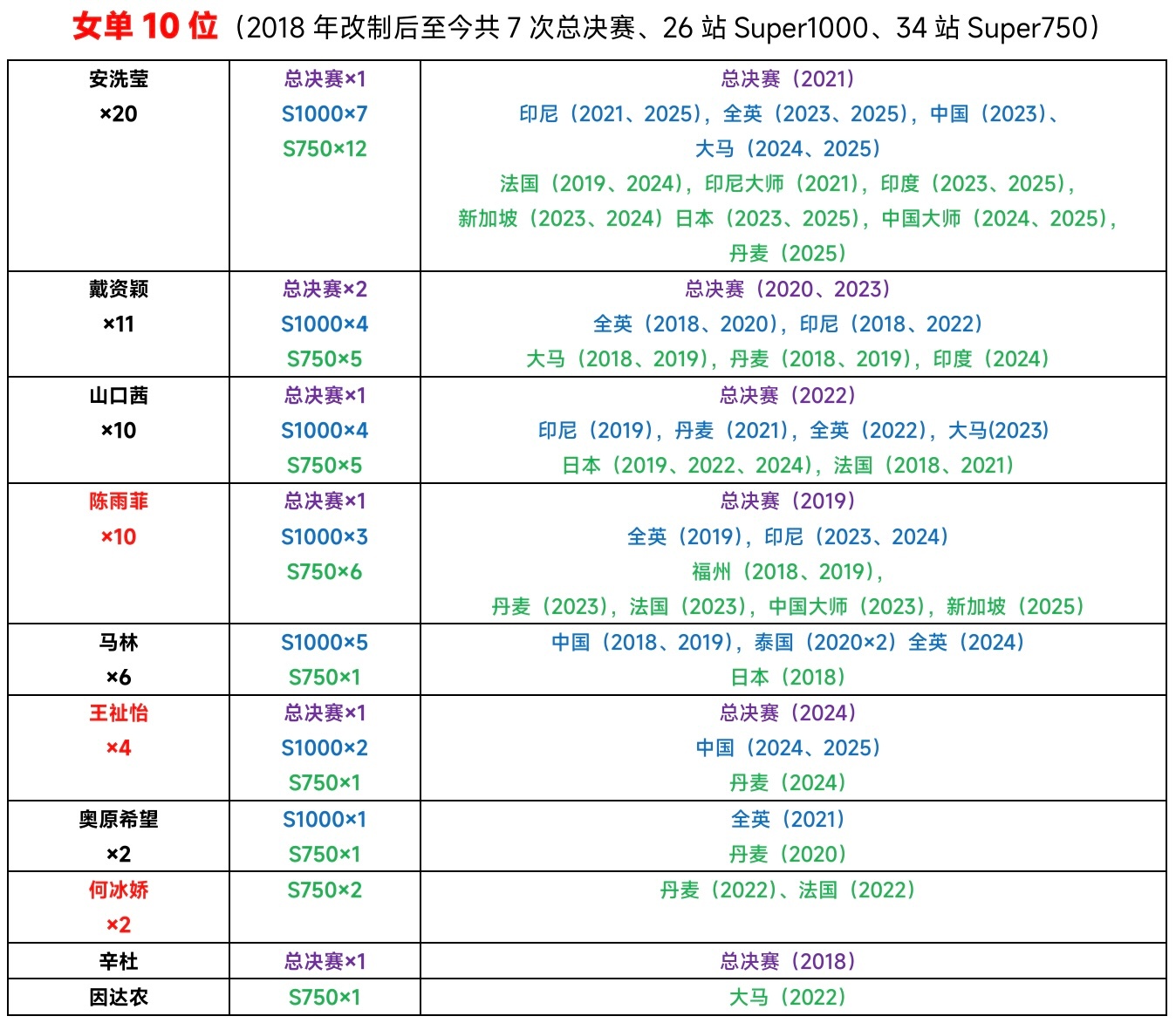 【2018年改制为世界巡回赛后的高级别巡回赛(含总决赛)冠军分布】截至2025年丹麦羽毛球公开赛 结束
