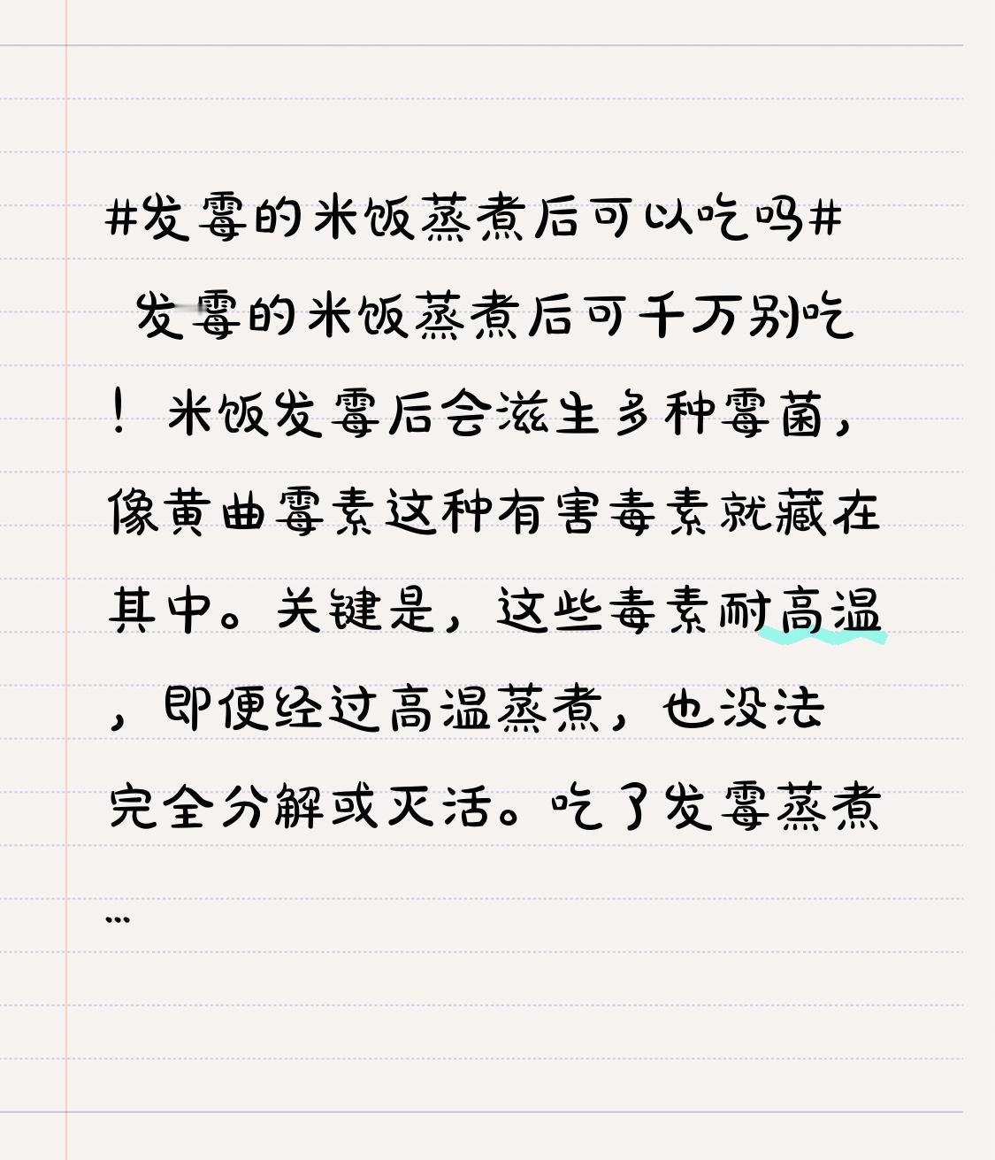 发霉的米饭蒸煮后可千万别吃!米饭发霉后会滋生多种霉菌,像黄曲霉素这种有害毒素就藏在其中。关键是,这些毒素耐高温,即便经过高温蒸煮,也没法完全分解或灭活。 吃了发霉蒸煮后的米饭,很可能引发胃肠道反应,腹痛、腹泻、恶心等症状说来就来。要是长期吃,患癌风险也会增加。之前就有人不小心吃了发霉大米煮的饭,结果上吐下泻。所以,一旦米饭发霉,赶紧扔,别心疼那点粮食,健康才是最重要的!