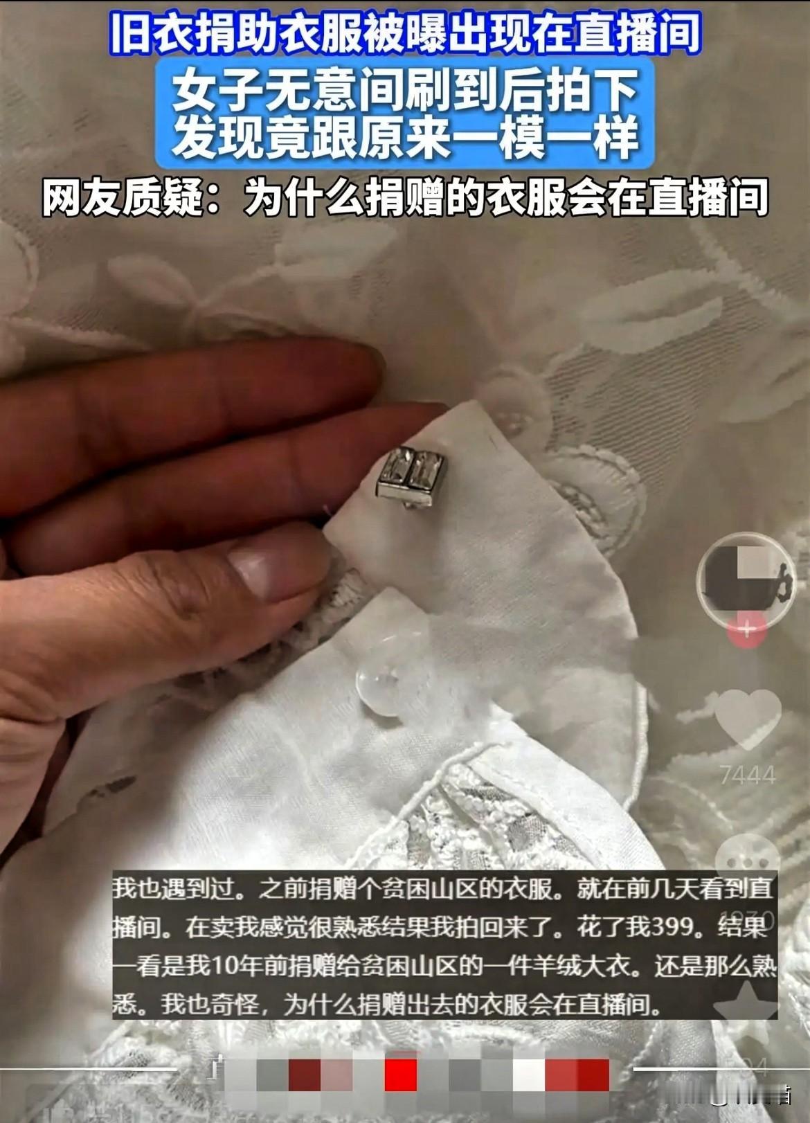 捐衣十年后直播间‘重逢’? 好心人的善意被当成了生意! 女子刷直播时,竟看到自己十年前捐给山区的衣服在售卖,399元买回后确认:纽扣是自己缝的! 评论区瞬间炸锅,不少人吐槽捐的衣服根本没到贫困者手里,有的被堆在仓库半年,最后按件卖给回收商。 与其让衣服被倒卖,不如直接捐给靠谱机构,甚至送给身边需要的人。 你捐过旧衣服吗?