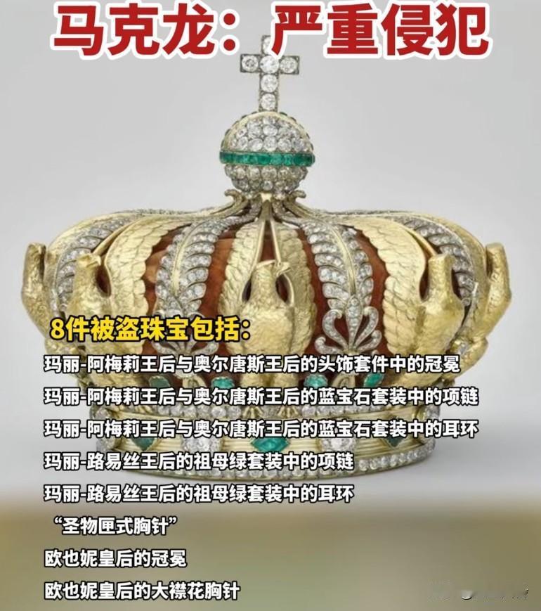 卢浮宫8件藏品失窃,名气大到难以销赃,卢浮宫:你卖不出去!窃贼:你操些闲心 怀疑都找好了下家吧,才会去干这事,一旦进入私家收藏就很难再面世了,等过个几十年再亮出来,再追究责任那也无济于事了。不难销账,金银就把它熔了,再卖出去,砖石就把它拆开一颗一颗的卖。马克龙也是牛逼了,几百年没出过的问题在他这儿轻而易举!估计那些国王,王后们后半夜都得排队去找他。 特朗普打开网购平台: 您的包裹在巴黎物流中心已发出…… 法国丢8件就大呼小叫,咱们紫禁城被八国联军抢光,圆明园被英法联军抢光烧光,是不是该做点什么?