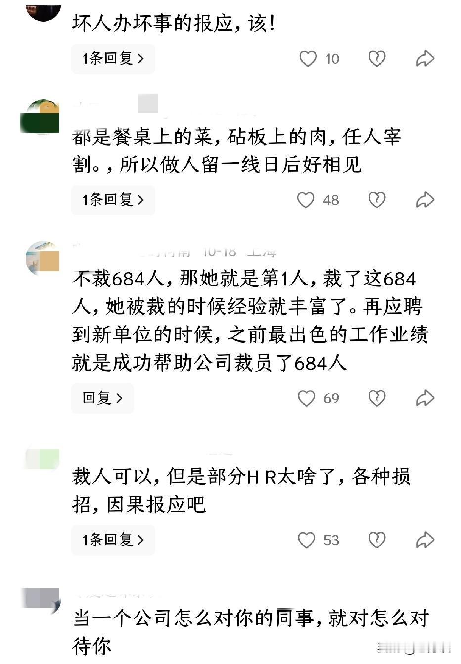 亲手裁了658人的35岁女高管,想不到第659 人被裁的竟然是自己!看到某视频,一位中年妇女称自己是公司的前人力高管。亲手优化了 658 名员工,想不到自己成为了659名被优化的员工。当这个视频被发出来之后,网友不是表示祝福,也不是表示可惜,而是表示幸灾乐祸。部分网友认为这是这位女高管坏事做多了的的报应,谁让她被当枪使,最终自己也被优化了。但是话说回来,这位女高管根据老板意思优化别人,并不一定是她的意思,即使她不去优化别人,也会有人来代替她去优化别人,那么她自己被优化的时间只会更早。她只不过是老板的一杆枪而已,要你往东,难道你敢往西吗?除非你不想干了。当你的利用价值被薅光之后,那么下一个就是自己了!打工仔命运就是如此!