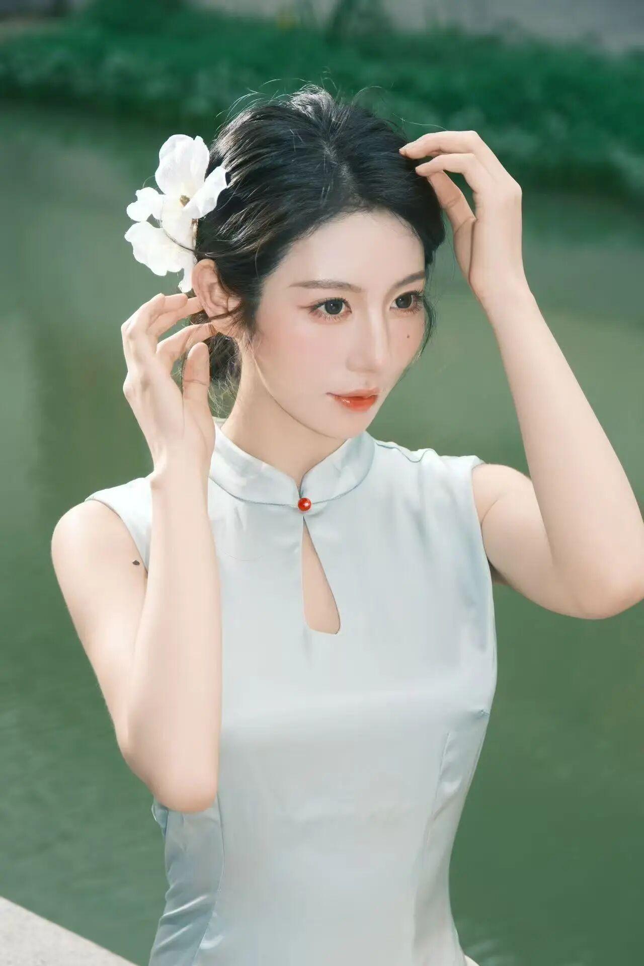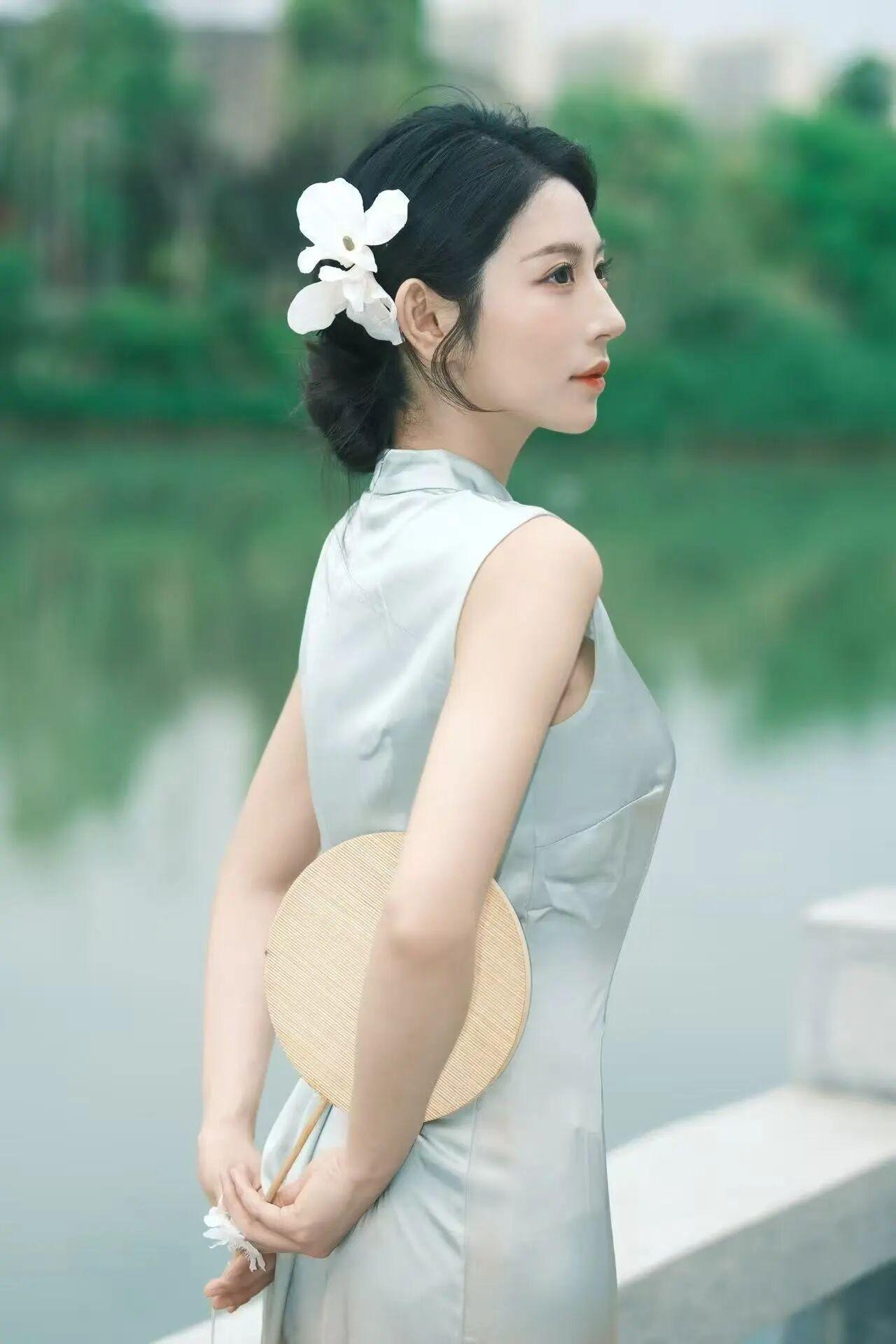 清新脱俗的汉服少女,手持一束白花,静坐湖畔,宛如画中人。
