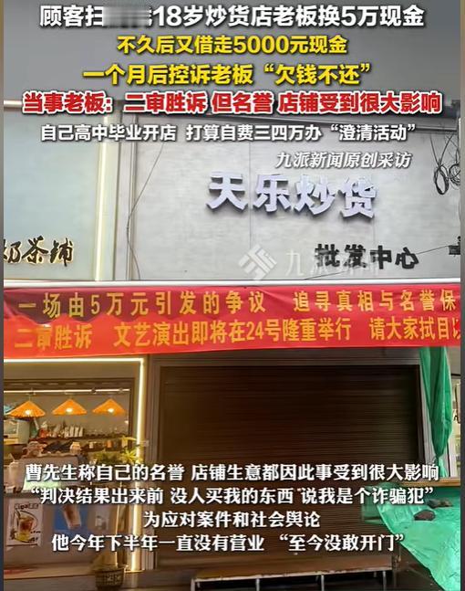 “现实版农夫与蛇?!”近日报道,湖南沅江,18岁炒货店老板好心帮顾客人兑换5万元现金,万万没想到,一个多月后,被对方拿着转账记录以欠钱不还为由,告上法庭。不仅如此,不少人还不相信他,认为他才是个骗子,名誉和生意都受到了很大的影响。不过好在法院审理后,还了其清白。 “你看,白纸黑字的转账记录,这还能有假?”18岁的店老板小曹没想到,仅仅一个微信转账截图,就让那些曾经熟悉的客人们看他的眼神中充满了怀疑。 原来,那天顾客刘某(化名)走进了小曹的炒货店。在购买了一些花生瓜子后,刘某便提出,他需要五万元现金,希望能通过微信转账的方式跟小曹换一下。 对于小曹来说,这是个不小的数目。他经营这家炒货店不久,五万元相当于店里两三个月的营业额。但看着对方焦急的神情,这个刚成年的年轻人还是选择了答应。他接收了刘某的微信转账,然后将沉甸甸的五万元现金交到了对方手中。 一个多月后,刘某再次出现在炒货店,但这次的目的却令人震惊,他声称当初的五万元转账是小曹的“借款”,如今要求归还。 “我什么时候向你借过钱?”小曹的震惊与困惑没有得到回应,取而代之的是一纸诉状。刘某凭借着手机里那张清晰的转账记录,将小曹以“欠钱不还”为由告上了法庭。 这个消息很快传开,周围人都觉得是小曹欠钱不还,被人找上了门:“真看不出来,年纪轻轻的竟然做这种事。”“现在的人啊,为了钱什么都能干出来。”“以后可不敢去他店里买东西了,谁知道会不会被骗。” 一些老顾客开始用怀疑的眼光打量他,邻里间的笑容也越来越少,导致店里的顾客明显减少,有时一整天都什么人。 更可怕的是精神上的折磨,小曹开始失眠,每天脑子都是这件事:“那段时间我真的很崩溃,很多人不相信我,觉得我就是个骗子。” 好在,法院最终还了小曹一个清白。 “就算法院还了我清白,可是那段日子对我的伤害太大了。”原来 ,小曹因为这件事,已经关门好几个月了。 可见,对于日常的大额现金往来,无论是借贷还是其他性质的资金转移,都应该留下明确的证据。一句微信聊天记录:“好的,我这就用现金换你的微信转账”,或者一个简单的书面凭证,都可能成为日后保护自己的关键证据。 不过,小曹虽然经历了这场风波,但仍然表示不会因为一次伤害就失去对所有人的信任。只是今后,他会在帮助他人时多一份谨慎,多一份保护自己的意识。 而我们每个旁观者,在对他人的行为轻易下判断前,也应该多一份审慎;在见证争议时,更应该多一份理性。 最后,只能说,善良依然珍贵,但需要带上智慧同行。 信源: 九派新闻——10月16日报道,湖南沅江,帮顾客换5万现金被控欠钱不还当事人发声:二审胜诉,但名誉、店铺受到很大影响,打算自费三四万办“澄清活动” 文│一阳 编辑│史叔