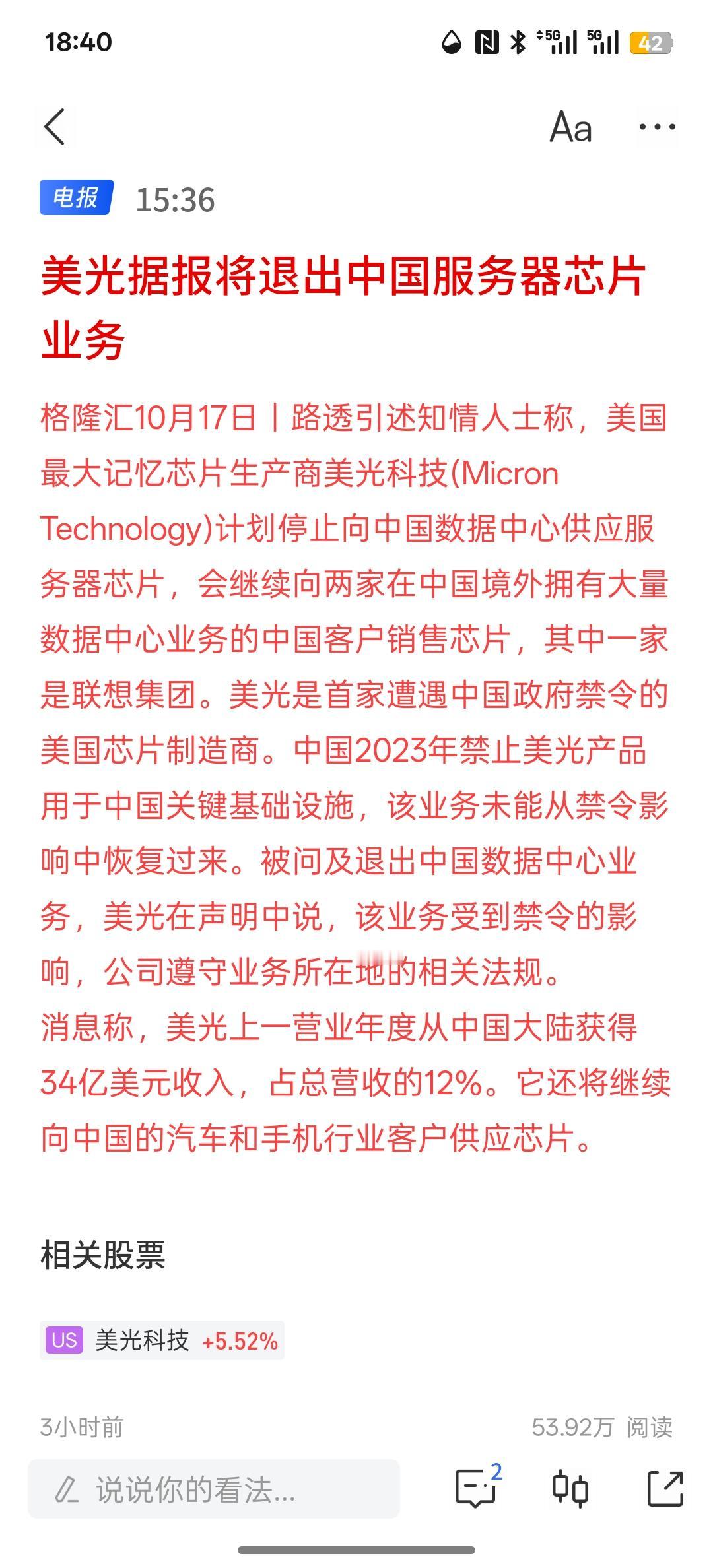 黄仁勋:英伟达在华高端芯片市场份额已从95%降至0% 美对华技术封锁是一个“错误” 美光也退出中国服务器芯片业务,但是他会对中国海外市场的公司进行芯片供货,美光是联想集团海外市场最大的供货商,也是芯片供货商!但他会继续向中国汽车和手机提供芯片!其实美光它的芯片在中国客户量还是比较大的,但从去年开始禁止它的芯片份额也在逐年下降,中国禁止美光芯片进入基础行业! 现在对于英伟达来说,同样美国的禁令就是个错误,英伟达的高端芯片无法进入中国市场,将失去这些份额,中国企业必然会填补这些份额!