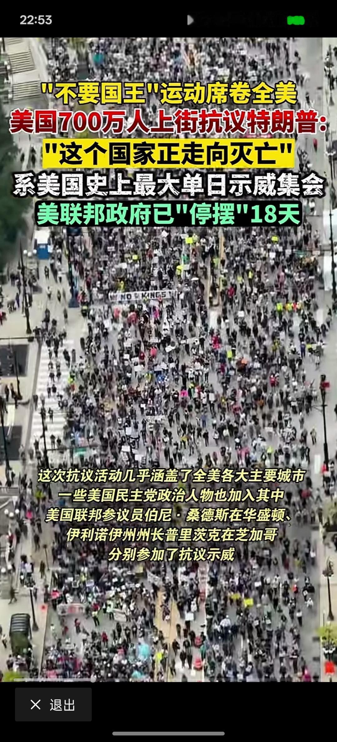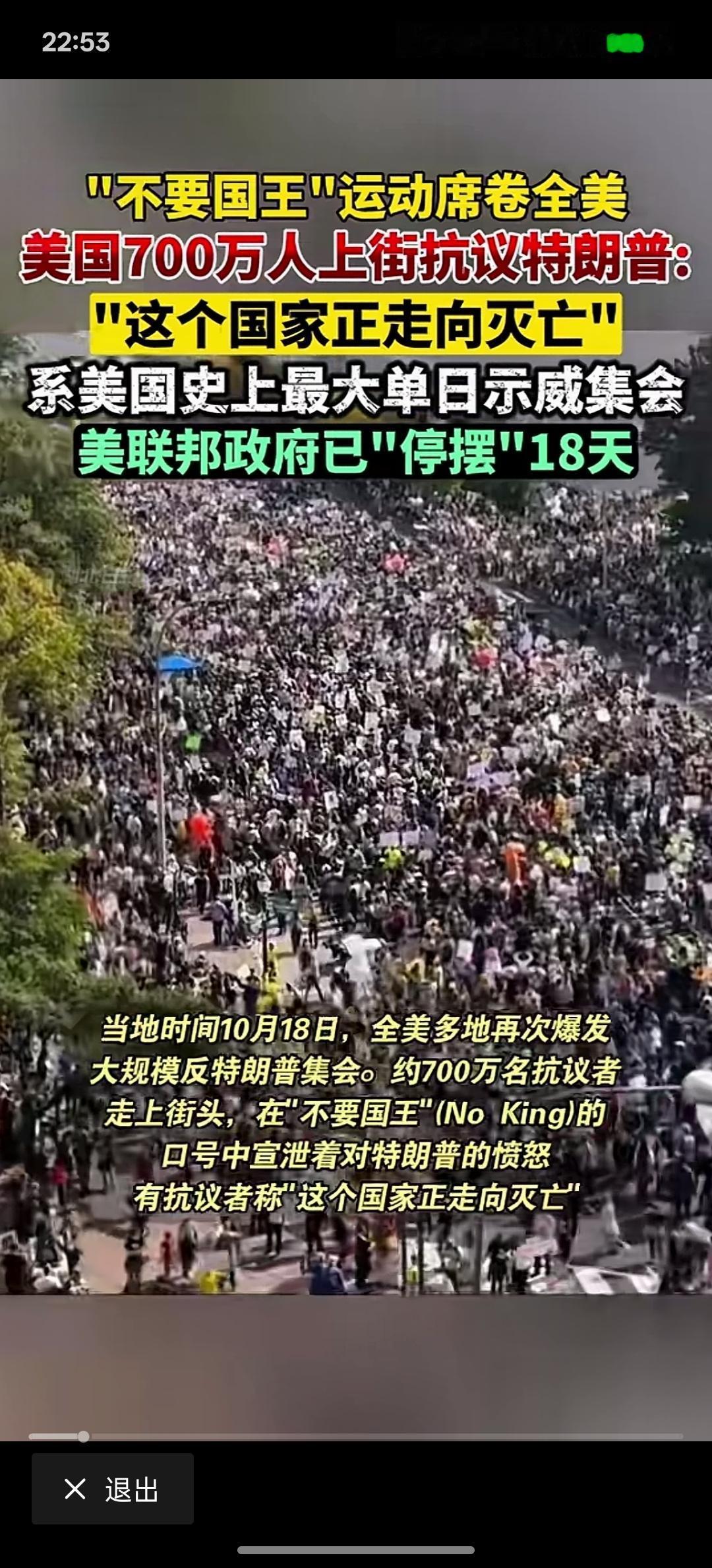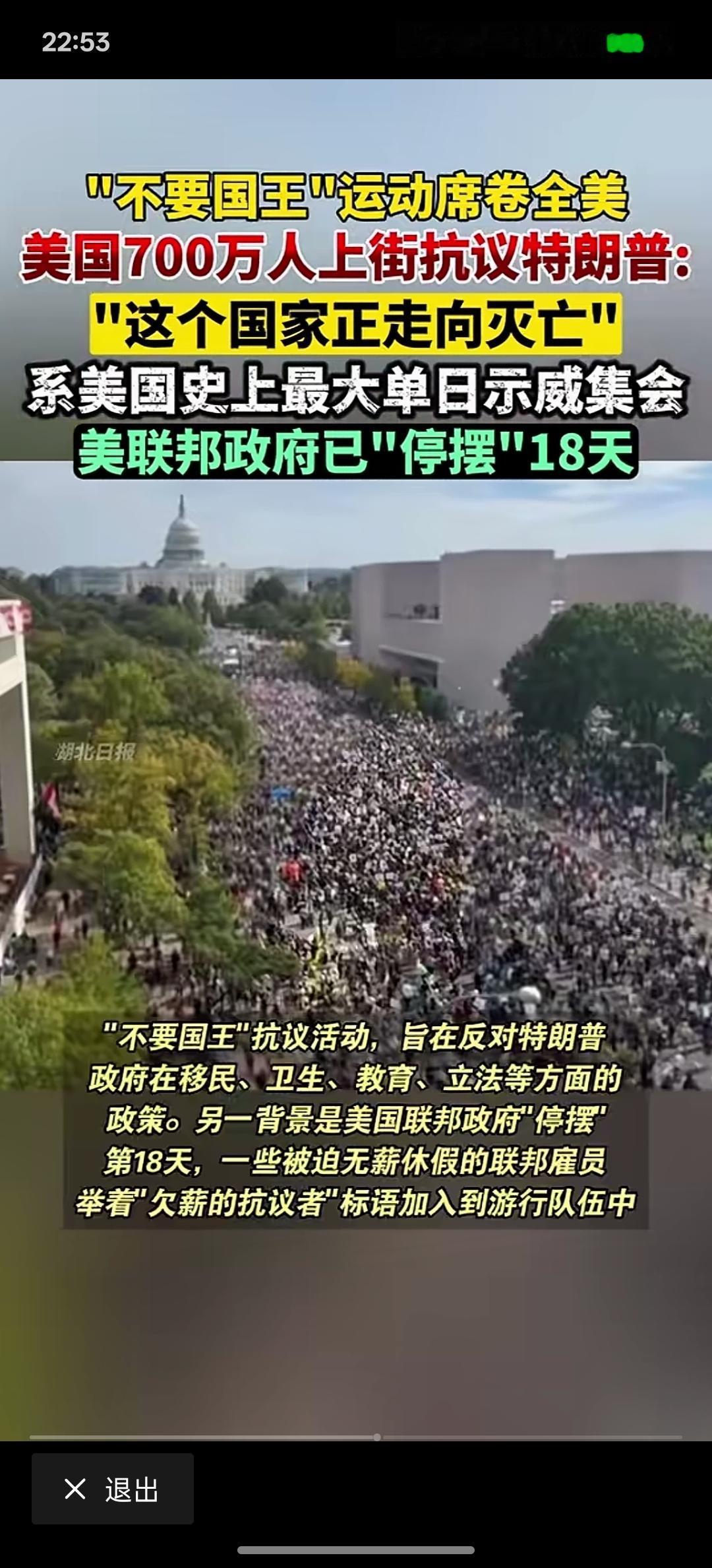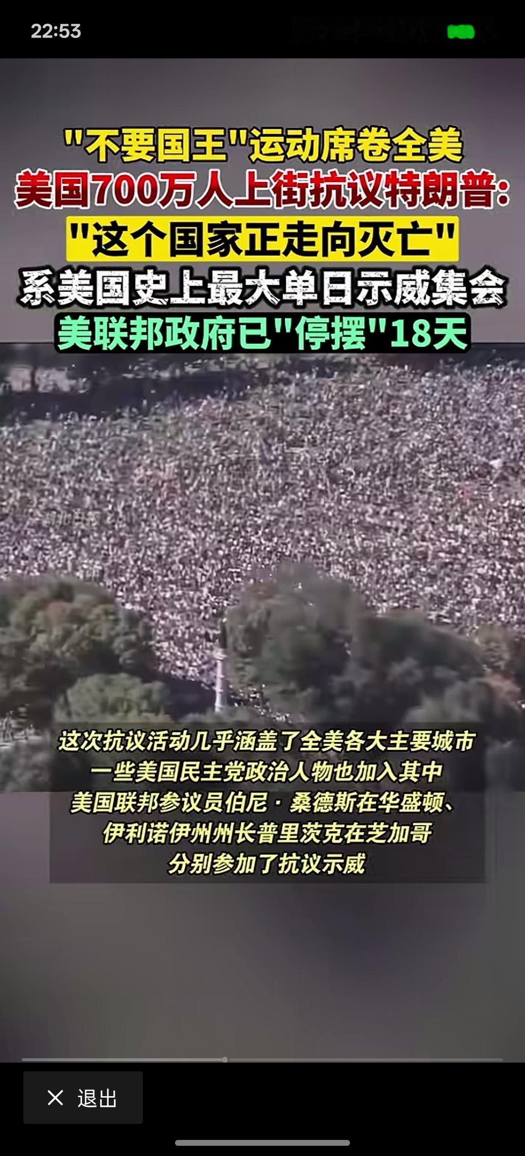 特朗普,可能又会受到狙击手的埋伏,特朗普这一次在机场疑似有人在设伏!目前,美国国内内部矛盾非常激烈,反对特朗普的声音越来越多,大量的民众聚集上街示威游行!这是今年来最大规模的反对游行示威!现在特朗普又整出国王的AI视频,导致民众反对声音加剧!同样,政府关门已经18天,军队无法拿到薪水!有些士兵自觉离开军队!现在美国国内两党之间的争论不休,只会导致美国越来越分裂
