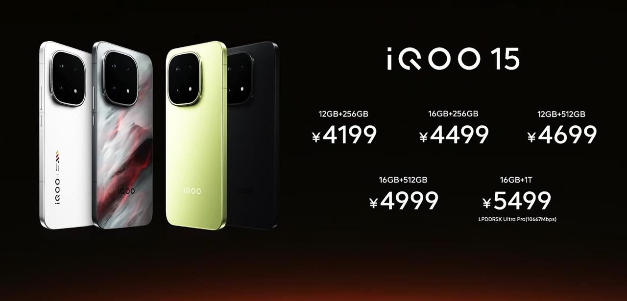 iQOO 15价格来了!大家觉得价格怎么样? 12+256GB售价4199元 16+256GB售价4499元 12+512GB售价4699元 16+512GB售价4999元;王者荣耀十周年版5499元 16+1TB售价5499元 iQOO Pad 5e售价1999元起 iQOO WATCH GT2售价499元起 iQOO TWS 5售价399元