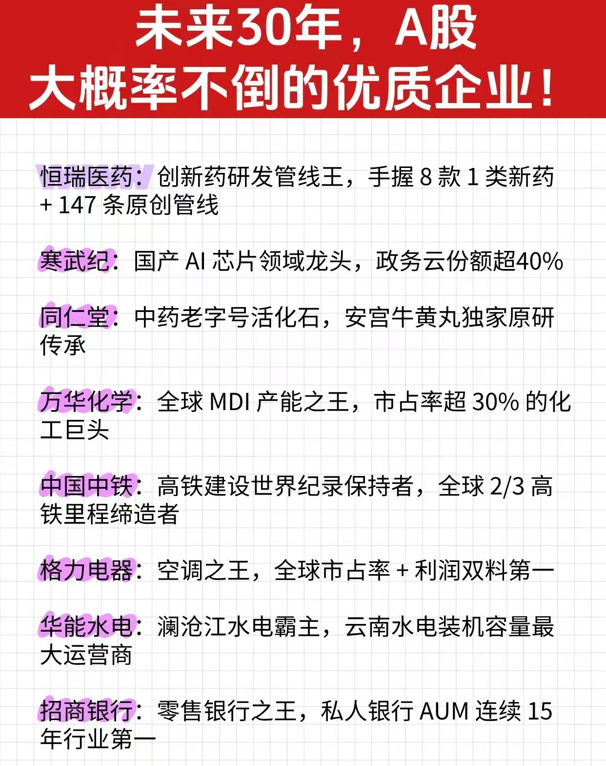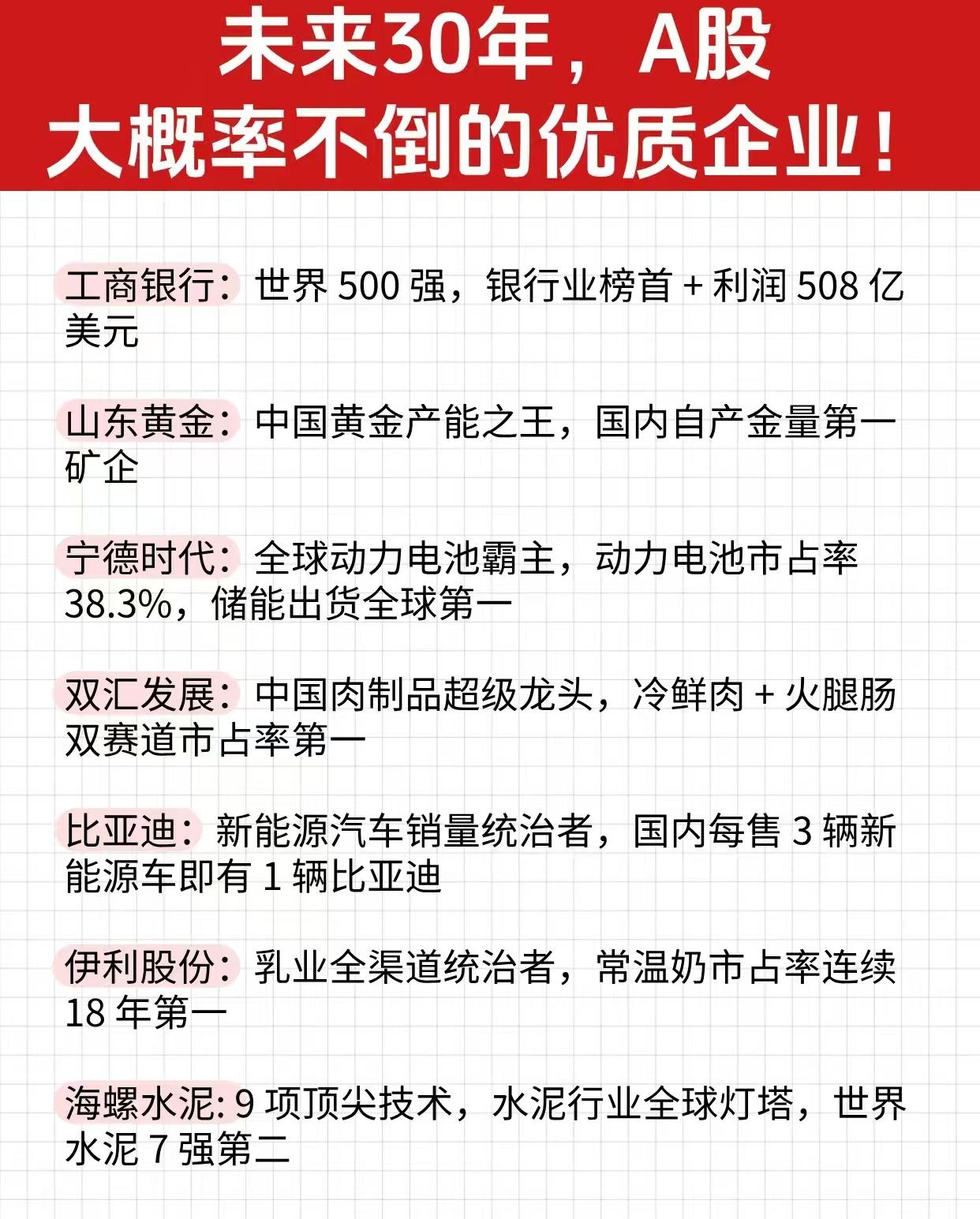 未来30年大概率不会到的优质公司长线抗风险题材概念,未来3年优质不会倒闭的公司具备的特征:高股息高分红、有核心壁垒、财务健康、净资产收益率高、行业白马龙头、央国企背景等等。 中国神华:全球领先的煤炭综合能源上市公司,业务覆盖煤炭、电力、新能源、煤化工等领域。央企控股上市公司,平均股息率7.6%。 国电南瑞:特高压设备霸主,国内电力智能化头部企业,市值超千亿。央企控股上市公司,中报数据净资产收益率5.87%。 理财有风险入市需谨慎!