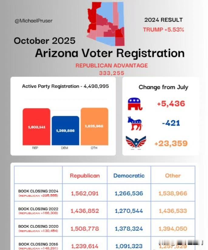 【黄金时代】在亚利桑那州,共和党选民登记数量已大幅领先民主党! 共和党目前领先超过33.3万选民。 这对明年中期选举,击败民主党州长凯蒂·霍布斯至关重要,这样共和党才能进一步确保亚利桑那州的选举胜利。