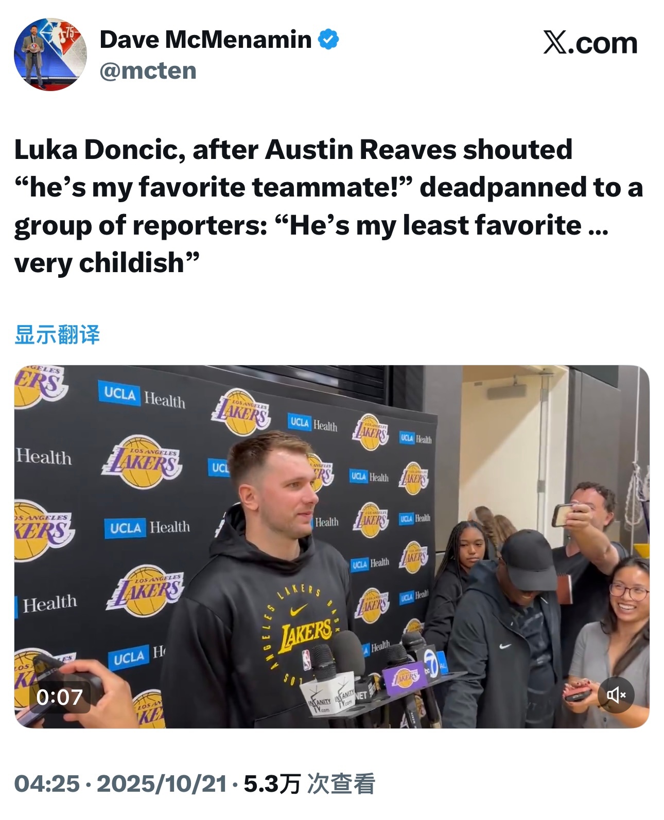 东契奇接受采访时听到里夫斯大喊“他是我最喜欢的队友”后,面无表情地对一群记者说:“他是我最讨厌的队友,非常幼稚。”[允悲]