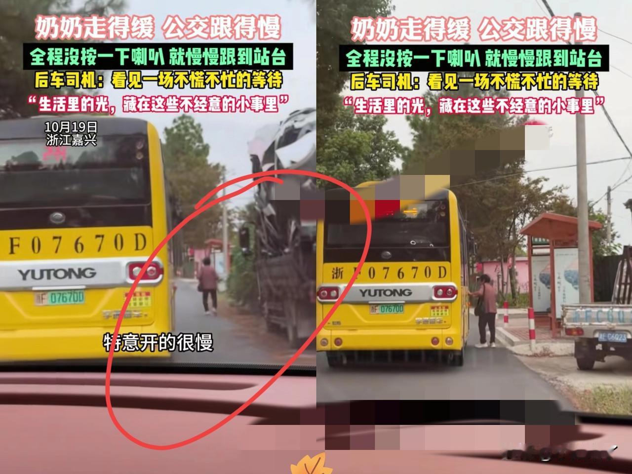 上人民日报了!浙江一男子开车回家,前方公交不停踩刹车,他起初以为对方故意别车!结果绕到右边一看,瞬间没了脾气: 白发老奶奶拄着拐挪得慢,公交就跟在一米外,车速比老人步速还缓,全程没敢按一声喇叭! 谁没遇过被前车“耽误”的情况?但这次真不一样!乡镇公交一天就几趟,对老人来说,这趟车可能是去镇上拿药的希望,是去看孙辈的盼头! 司机哪是在“耗时间”,是把“怕老人赶不上”“怕喇叭惊着老人”的心思,全揉进了慢下来的每一秒里! 难怪人民日报都点赞!比起大张旗鼓的善举,这种藏在烟火气里的体谅才最戳人! 是不催不赶的等待,是把别人的难处悄悄放在心上。后车大哥后来也跟着减速,这一慢,慢出的是双向的善意! 为公交司机点赞,也为后面默默跟随的男子点赞!