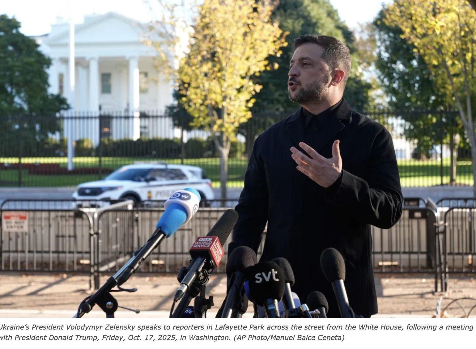 泽连斯基拒绝了出让领土的建议,所以不被允许在白宫草坪开新闻发布会,但他在白宫对面