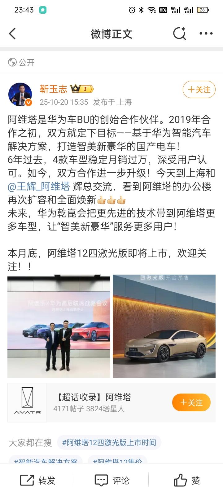 家人们,智能车圈要变天了!华为智能汽车解决方案BU CEO靳玉志最近去了阿维塔上海新办公楼,明眼人都能看出来,这是为月底要上市的阿维塔12四激光版“站台”,就冲这车带的华为乾崑技术,上市后大概率要被抢着订! 靳玉志在微博里说,阿维塔是华为车BU的创始合作伙伴,2019年就约定要造“智美新豪华”国产电车。现在6年过去,4款车月月卖过万,靠的就是实打实的技术力。这次新车更是直接拉满配置:乾崑智驾ADS 4、鸿蒙座舱 5,还有四颗顶级激光雷达,全域超强感知力直接碾压同价位车型! 要知道现在选智能车,大家最看重啥?就是辅助驾驶靠谱、车机好用。华为乾崑这技术可不是“纸上谈兵”:乾崑智驾和鸿蒙座舱的装车量都突破100万台,截至9月华为乾崑累计辅助驾驶里程超过51.3亿公里,相当于绕地球12万多圈,百万用户都验证过的靠谱。反观同价位车型,要么激光雷达数量少,要么辅助驾驶系统没经过这么多实战考验,阿维塔这波直接把优势拉满。 靳玉志还说未来会把更先进的技术带给阿维塔,这意味着买了这车,后续还能享受到技术升级。月底新车上市,想入手智能车的朋友真得抓紧,就这技术优势,晚了说不定要等车很久。