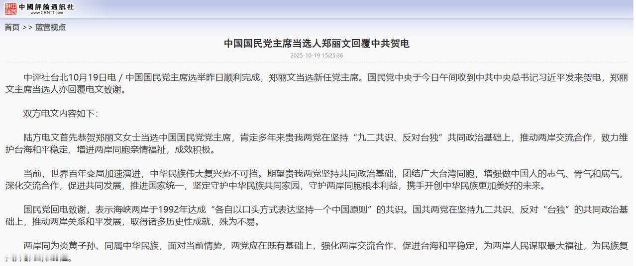 中共贺电直指“国家统一”,郑丽文复电没敢接“统一”二字,但她接了更狠的“民族复兴”!这比朱立伦2021年的回复,强硬了十倍! 10月19日,也就是中国国民党主席选举结束后的第二天,中国大陆就给新任主席郑丽文发去了贺电,这事很快就成了大家讨论的热点。 这份贺电不只是简单道贺,更关键的是明确提到了两岸关系的“定盘星”——坚持“九二共识、反对台独”,还肯定了她在这个基础上做的工作。 这么多年来,我们在处理两岸关系一贯是这个立场,“九二共识”是让台海能保持和平稳定的重要基础,也只有守住这个起码得底线,两岸之间的交流合作才能顺顺利利地走下去。 面对这份带着原则和期待的贺电,郑丽文的回电也给出了积极的回应。她明确说国民党会继续坚持“九二共识”,这个表态直接回应了大陆最关心的问题,也为两岸接下来能继续对话留下了关键的基础。 更让人关注的是,她在回电里强调“两岸同为炎黄子孙、同属中华民族”,这话从根上说明了两岸是一家人,而结尾提到的“为民族复兴开辟宏伟前程”,更是把两岸关系的发展和整个民族的未来紧紧绑在了一起 跟现在民进党当局搞的“台独”分裂那套比起来,国民党这次的表态明显更有建设性。 民进党这些年一直在推“去中国化”,故意挑动两岸对立,把台海和平稳定的底子都快搅坏了。而国民党坚持“九二共识”、承认两岸同属一个民族的立场,无疑给两岸关系添了份稳定的力量。 其实大家都清楚,民族复兴从来不是哪一方单独能做成的事,必须得两岸同胞一起参与、一起使劲。从历史上看,中华民族能不能复兴,跟两岸关系怎么走密切相关,只有两岸放下分歧、手拉手合作,才能把民族的力量拧成一股绳,实现大家共同的发展目标。 大陆这边一直抱着“两岸一家亲”的想法,推动两岸在经济、文化、社会各个领域搞交流合作,说白了就是想让两岸同胞都能过上更好的日子,一起把民族复兴的故事写好。 郑丽文回电里提到的“民族复兴”,和大陆的发展愿景是完全对得上的,这说明在关乎民族大义的问题上,两岸有着很多共同的想法。 现在世界正处在百年都少见的大变化中,中华民族的复兴既有难得的好机会,也得应对不少挑战。这种时候,两岸更得珍惜现在好不容易达成的共识,把民族利益放在最前面,一起抵制“台独”分裂势力,为台海的和平稳定和民族复兴的大事业一起努力。 从贺电里期待“国家统一”,到回电中承诺“民族复兴”,这背后其实是中华民族最深层的命运联系。不管是“九二共识”这个政治基础,还是民族复兴这个共同目标,核心都离不开一点——两岸同胞血脉连着血脉,好与坏都绑在一起。 希望更多的台湾同胞们能看清,“台独”是死路一条,尽早回到祖国的怀抱,一切都只会向着更好的方向发展!