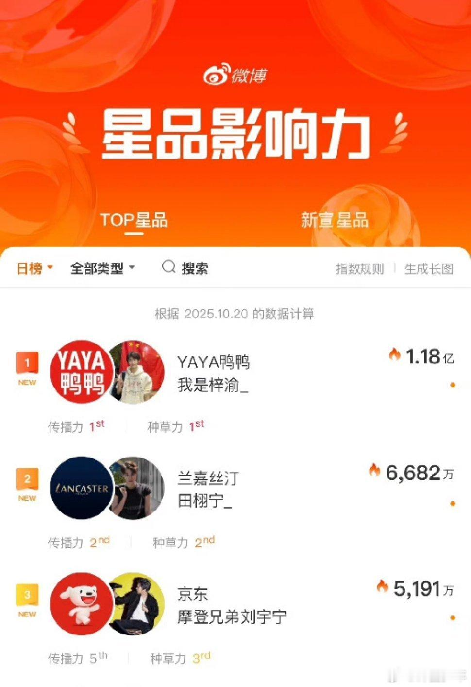 星品影响力top3 星品影响力top3🈶:梓渝&鸭鸭、田栩宁&兰嘉丝汀、刘宇宁&京东!!