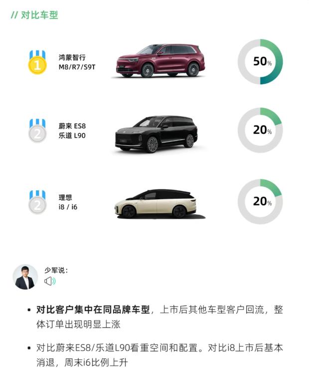 首周大定破6万,全新问界M7产品力获高度认可 全新问界M7上市后网上舆论反馈高于预期,但真正支撑其首周官方大定破6万台的,并非短期流量狂欢,而是大量长期关注者的理性转化。孙少军指出,订单客户普遍对产品有深度了解,认为价格符合预期,决策周期长但转化稳定。 这形成一种有趣反差,外界热议配置或价格,而真实用户更在意试驾体验是否扎实、辅助驾驶是否可靠。门店数据显示,进店量上涨50%~70%,用户中心店表现突出,且一二线城市占比达70%,说明高线市场对全新问界M7的产品力高度认可。 更关键的是,这批用户中纯新增比例高,且女性明显增多,运动套件选装感知甚至超过M8、M9。随着国庆热度持续上涨,其关注度进一步提升。