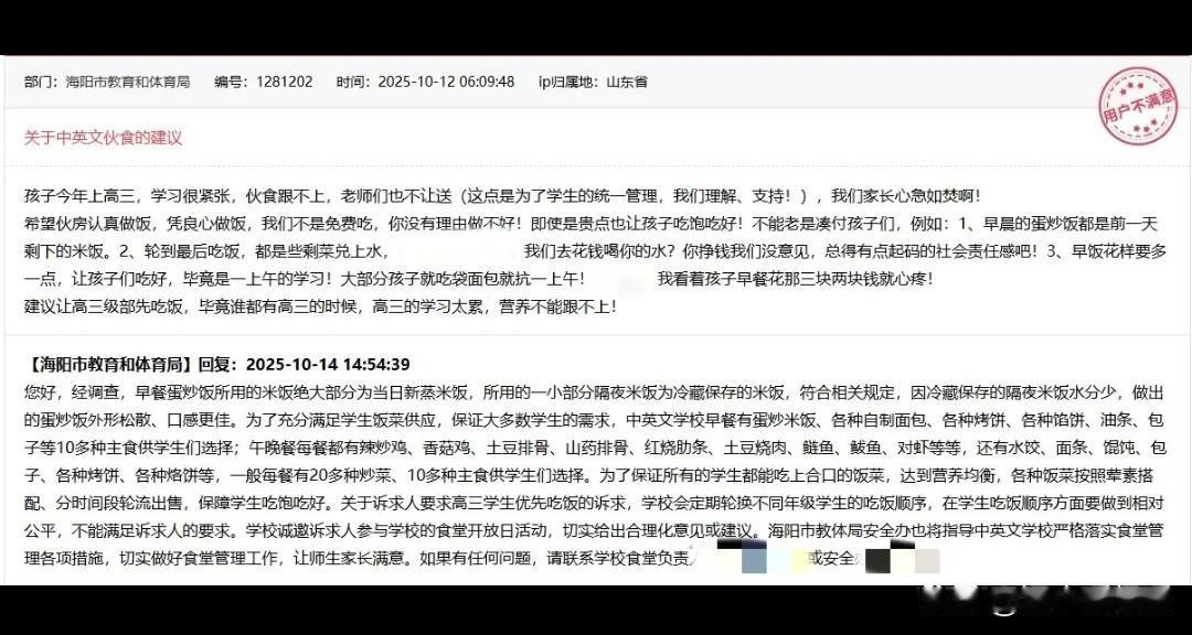 😟 听说高中食堂给孩子吃隔夜饭,剩菜还兑水?这事儿最近可让不少家长揪心了。 别急,官方回应来了!海阳市教体局调查后发现,早餐蛋炒饭大部分用的是新蒸的米饭,只加了少量冷藏的隔夜米饭,而且这种做法是符合相关规定的。据说,冷藏过的隔夜米饭水分少,炒出来口感反而更好。 至于“剩菜兑水”的问题,学校和教体局都明确表示不存在。学校称当天的剩菜都会倒掉,教体局工作人员去学校陪餐时也发现,学生们吃完后菜还有剩余,根本不需要这么做。 其实,这家学校的伙食选择挺多的,早餐有十多种主食,午晚餐光炒菜就有二十多种,主食也有十几种,就是希望孩子们能吃好。 孩子在学校吃得好不好,是每一位家长心里最大的牵挂。这次事件后,当地教体局表示会继续指导学校落实好食堂管理。咱们一起盯着,让孩子吃得既安全又营养! 消息来源:潇湘晨报、海阳市教育和体育局