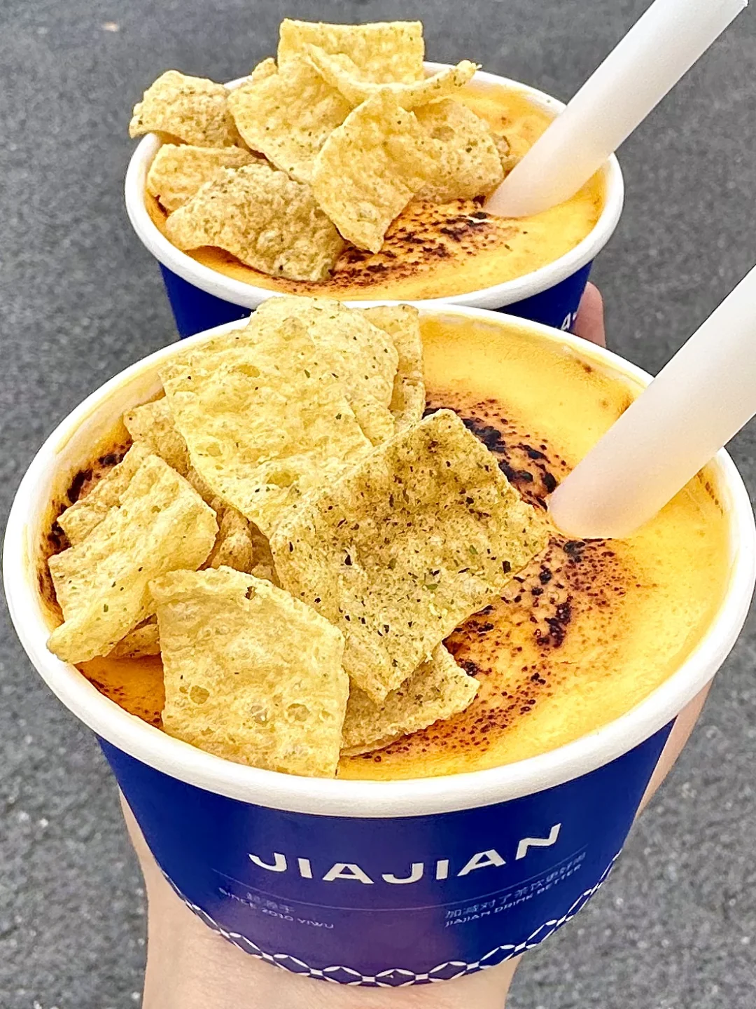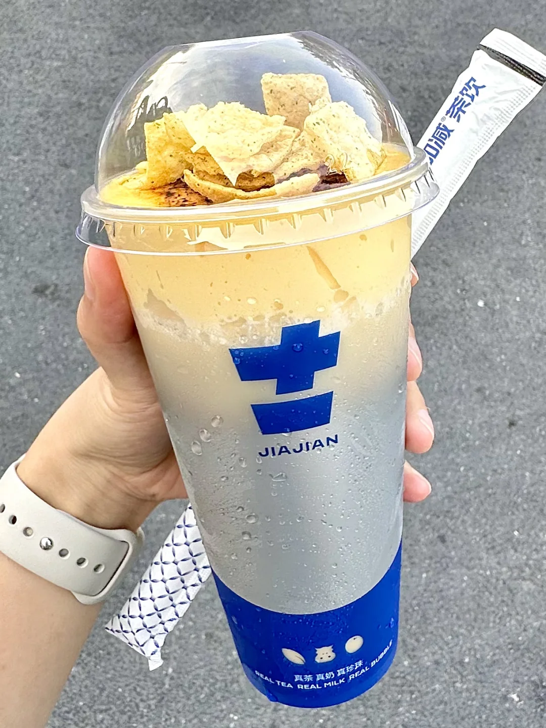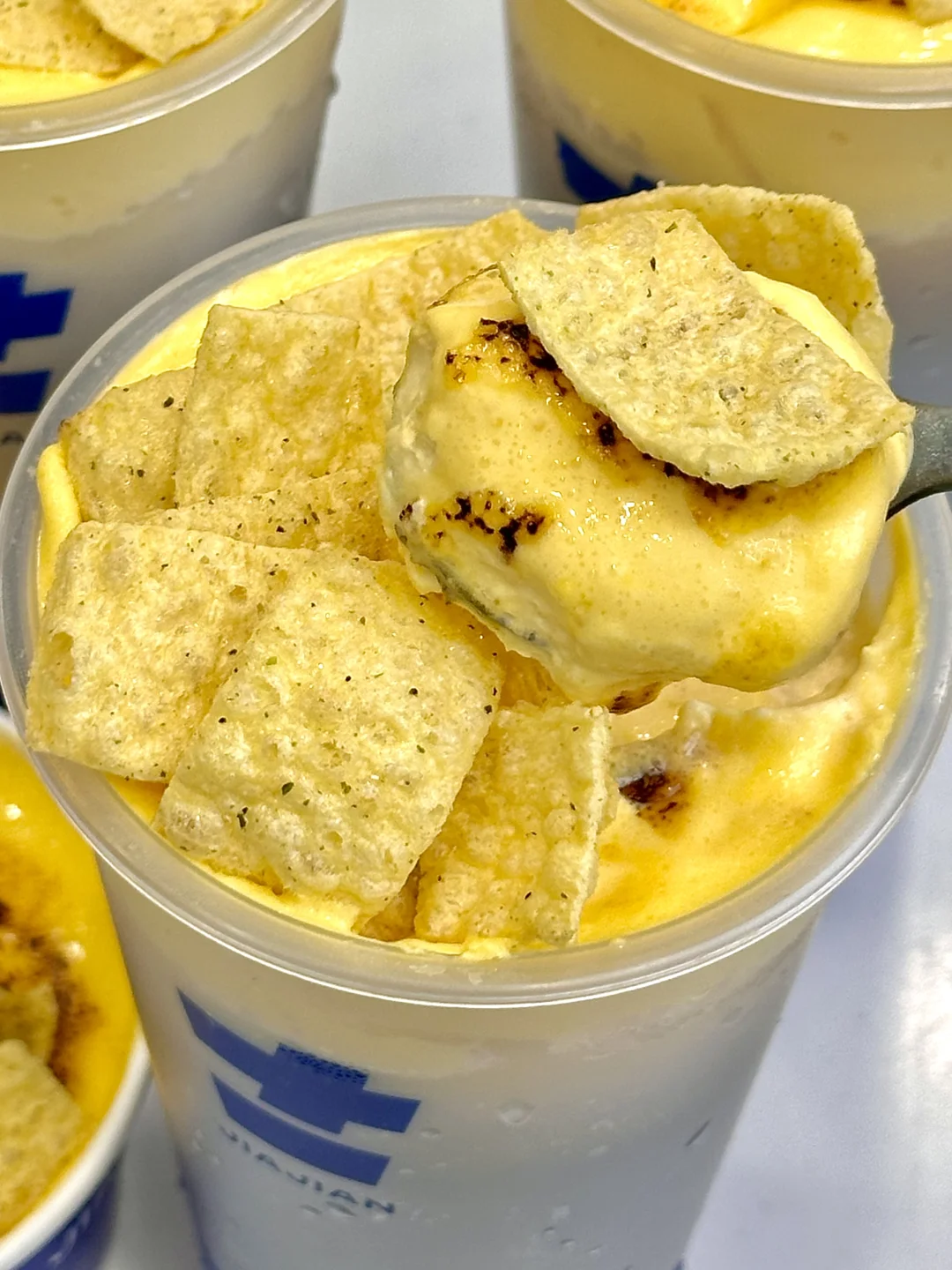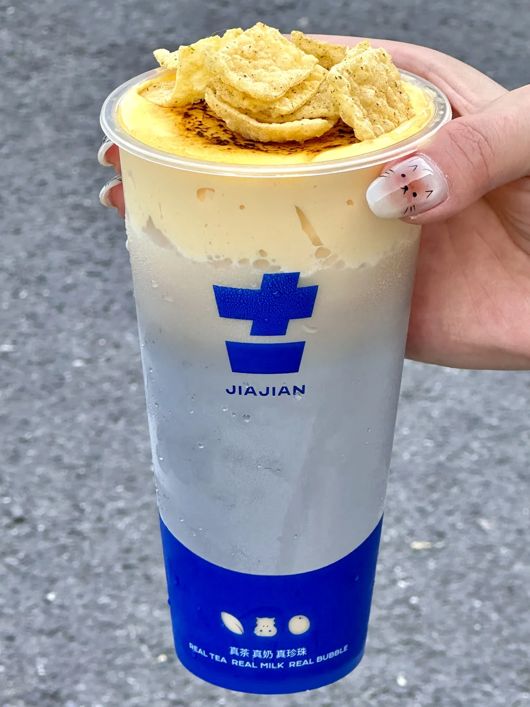 炭火轻烤的贵妃乌龙底搭配悦鲜活鲜奶!茶香混着焙火香,入口超丝滑!顶部烤布蕾焦香十足,先吃一口布蕾+海苔锅巴,咸甜党一口沦陷!搅匀后也很好喝!越喝越上头~