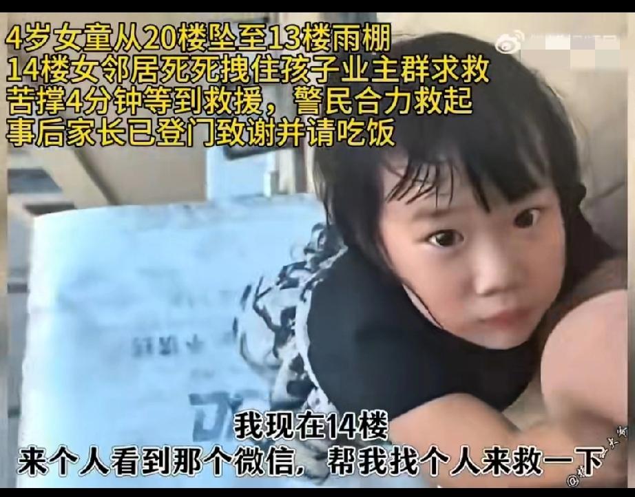 🔺惊险!女童从20楼坠入13楼窗台,女子发现后紧抓不放大声呼救。 🔺当事人称不敢看评论:因为总有人质疑,说我救人为什么会有时间拍视频。 🔺网友愤怒:救人的手在抓生命,敲键盘的手在造粪坑。坠楼故事 小女孩坠楼 坠楼少女 救人一命,会有福报吗?