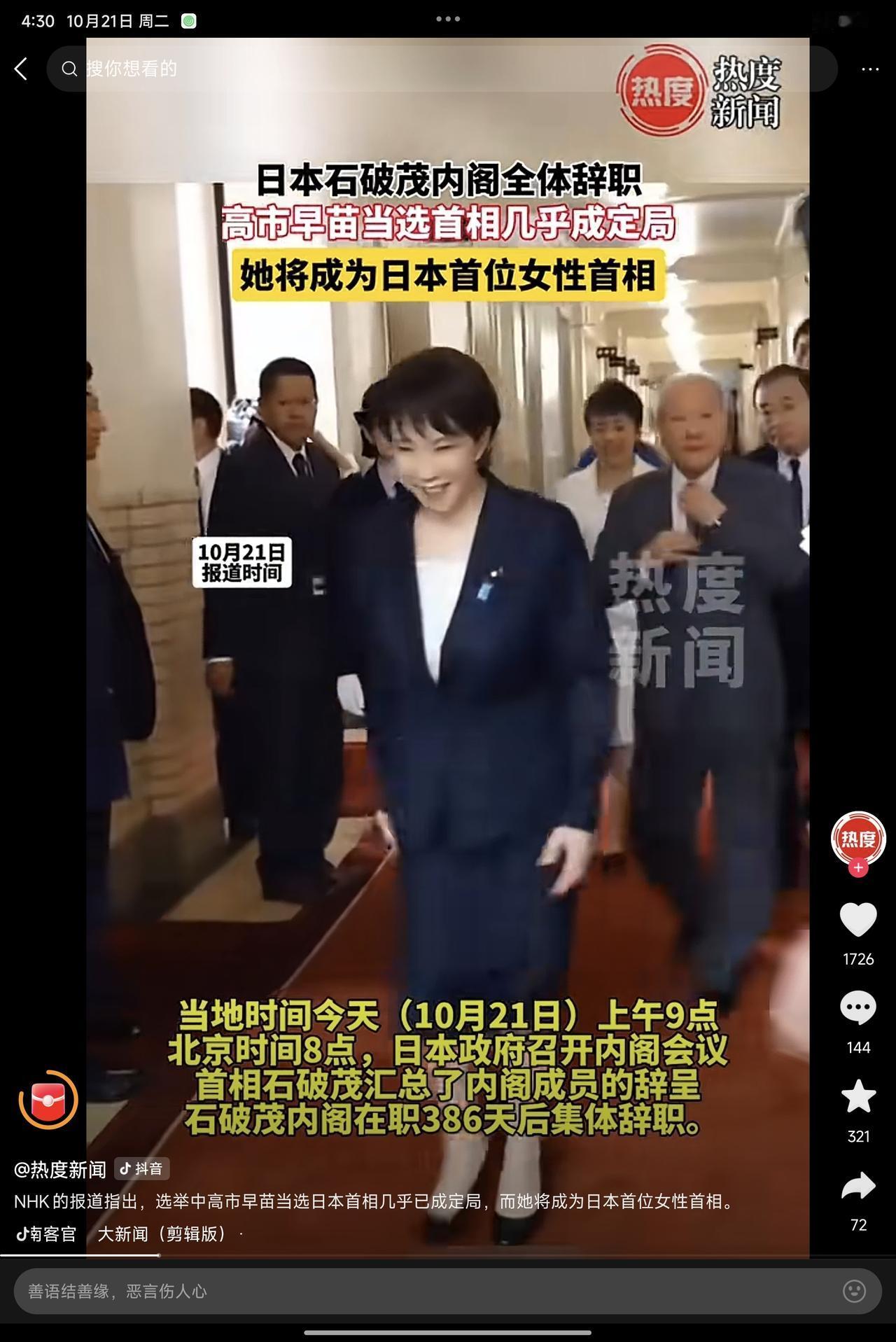 日本首位女首相诞生!右翼代表高市早苗众议院胜选,政治立场与制度规则引热议 10月21日,日本政坛迎来历史性一刻,自民党总裁高市早苗在众议院首相指名选举首轮投票中斩获过半票数,成为该国首位女首相 。 尽管参议院投票仍在进行,但凭借众议院在首相任免中的优先决定权,她已事实上锁定第104任首相之位。 现年64岁的高市早苗,是日本政坛公认的“极右翼政治家” 。她不仅多次参拜供奉甲级战犯的靖国神社,还否认日本侵略历史,宣称过往对外战争是“自卫战争”。 政策上,她主张修改和平宪法、将自卫队更名“国防军”,并以“中国威胁论”为借口呼吁大幅增加防卫开支 。 这一结果迅速引发中国网友热议。 不少网友直言“警惕性拉满”:“作为安倍晋三接班人,她一直鼓吹‘台湾有事就是日本有事’,涉台立场顽固” ,担忧其执政后会加剧地区紧张。 也有网友关注其历史态度:“连侵略历史都不反省的政客,很难相信会推动和平发展”。 高市早苗的当选,既是日本女性政治地位的突破,也暴露了右翼势力的抬头。其激进的安保主张与模糊的历史观,无疑将给中日关系及东亚局势带来新的不确定性。日本新任首相 日本新首相 早苗幸子