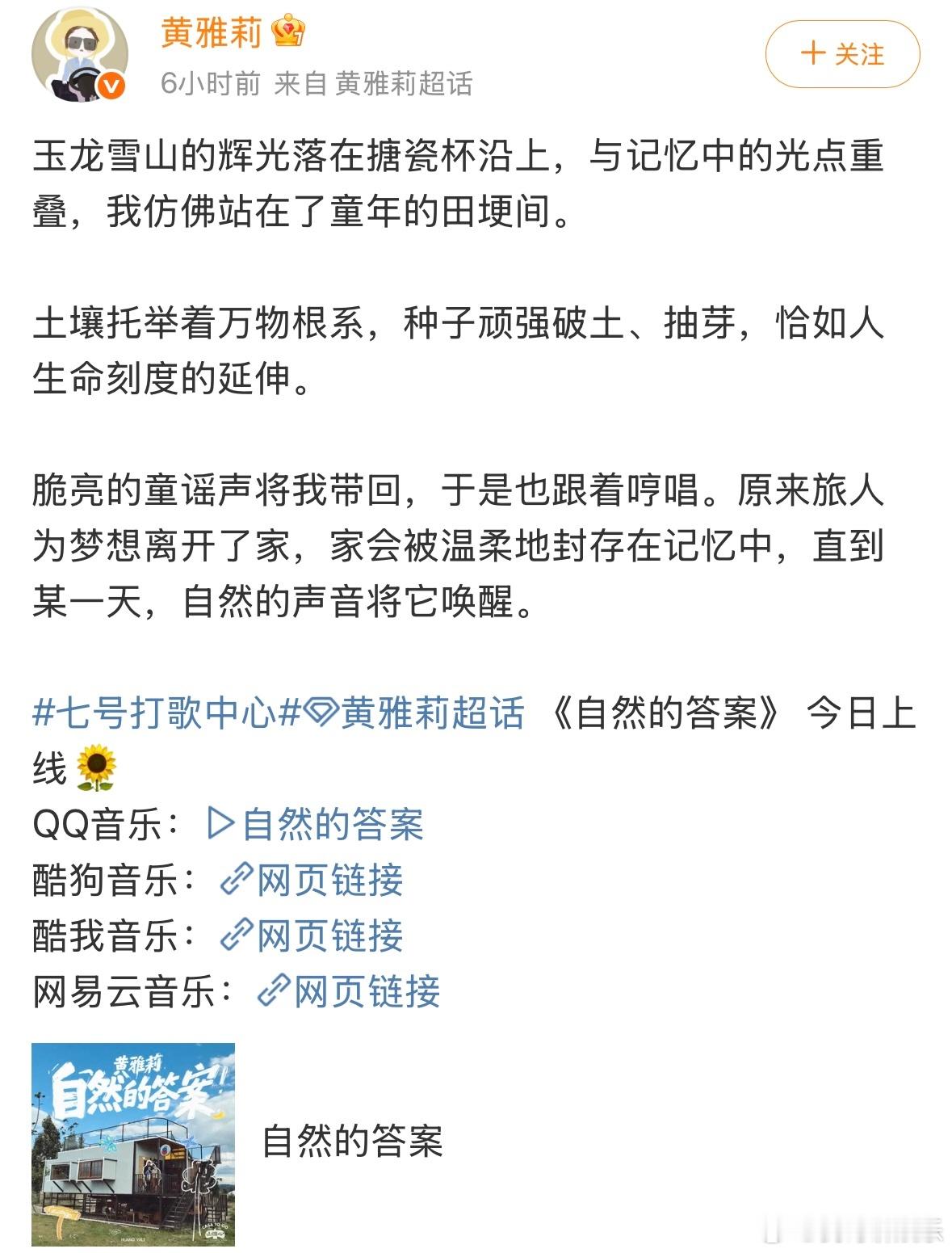 在黄雅莉的歌里吃到细糠了 谁还没听黄雅莉的《自然的答案》?前奏的纳西族童谣一响,仿佛回到小时候哼歌的傍晚,治愈到不行,黄雅莉请多唱!