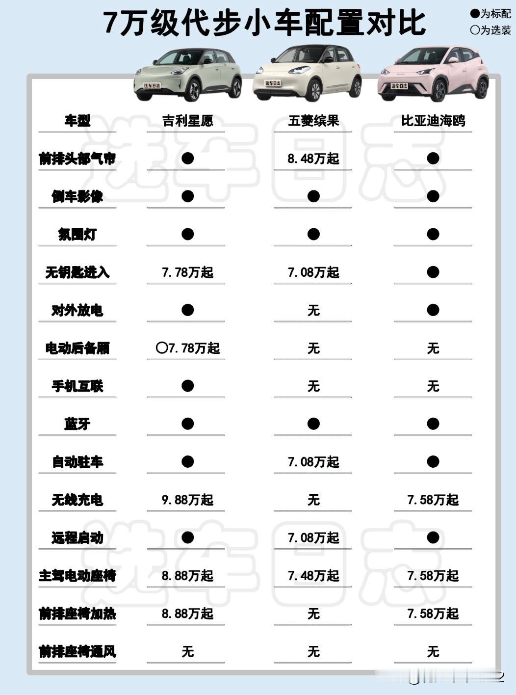 7万适合女生代步的小车,我觉得还是吉利星愿性价比高。 刚毕业的女生们手里预算不足,但只需要7万也能买到很实用的代步小车。 吉利星愿、比亚迪海鸥、五菱缤果是这个价位3款比较合格的选择,后两者销量较高,但吉利星愿的配置较高,并且是同级别少有使用后多连杆独立悬架的车型,舒适性会更好。 吉利星愿汽车 吉利星愿微型车 吉利星愿青春版 吉利星愿纯电 吉利星愿车评 吉利星愿梦想车 武汉吉利星愿