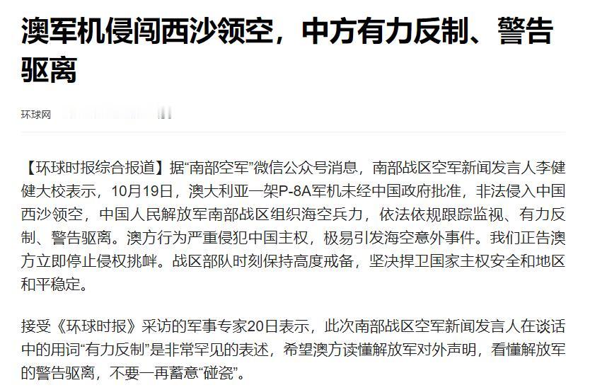 澳军哭诉“中国战机近距离发射照明弹”,南部战区回应:侵闯西沙领空,中方依法驱离! 10月20日,澳大利亚军方突然跳出来“喊冤”,澳防长马尔斯公开声称,澳军一架P-8A反潜侦察机在南海搞所谓“例行巡逻”时,遭到了解放军苏-35战机的“不安全、不专业”拦截,还说中国战机发射的两枚照明弹离他们的机身特别近,把他们“吓坏了”。 就在澳方炒作没多久,我解放军南部战区当晚就给出了权威回应,把事情的来龙去脉说的明明白白:根本不是什么“拦截”,而是澳军机没打招呼就非法闯进了中国西沙领空,中方是按照法律规定对它进行驱离,全程合法合规。 西沙群岛作为我国领海内的岛屿,我们本就对这片海域和上空拥有绝对的主权,这是有充分历史依据、法律依据的,国际社会也都认可。就像自家院子一样,别人没经过允许就闯进来,主人出面制止不是天经地义吗? 澳军这种擅自闯入的行为,本身就是严重侵犯中国主权的做法。更何况,澳方嘴里说的“例行巡逻”其实就是个幌子,本质上就是来挑衅的。 这些年,澳大利亚老跟着某些国家跑,频繁派军机、军舰到南海来晃悠,动不动就抵近中国领海领空搞侦察,美其名曰“航行自由”,实际上就是在破坏南海的和平稳定。 这次派来的P-8A侦察机,本身就是专门搞反潜、侦察的机型,跑到西沙领空来,显然没安好心。在这种情况下,中方苏-35战机采取发射照明弹的方式驱离,完全是为了保护国家的主权和领土完整,这是每个主权国家都有的权利。 而且我方驱离的方式很专业、很克制,就是用明确的信号告诉澳方“你越界了,赶紧离开”。 “照明弹”是一种常见的警示手段,不是什么“危险武器”。照明弹的作用就是发出明显的光信号,让对方清楚看到我方战机的位置和意图,同时明确传递“离开”的指令,全程没有任何攻击性。 反倒是澳军的行为才真的危险,无视中国的主权,大摇大摆闯进敏感空域,这种鲁莽的做法很容易让双方产生误判,一旦出点意外,后果不堪设想,对整个地区的空中安全都是极大的威胁。 托某些国家不怀好意的福,我军在处理类似这种事一向很有分寸且经验丰富,既不会让国家主权受侵犯,也不会主动激化矛盾,专业素养摆在那儿。 说到底,我们对南海诸岛及其附近海域的主权是板上钉钉的事,中国军队的职责就是守好家门口,坚决不让国家主权受一点损害。有些国家总想通过抹黑中国来掩盖自己的错误,但事实就是事实,再怎么狡辩也没用。 我军南部战区在回应里已经说得很清楚,正告澳方停止这种侵权挑衅的行为。