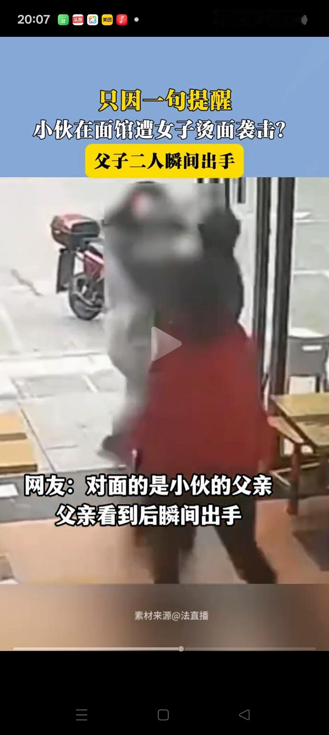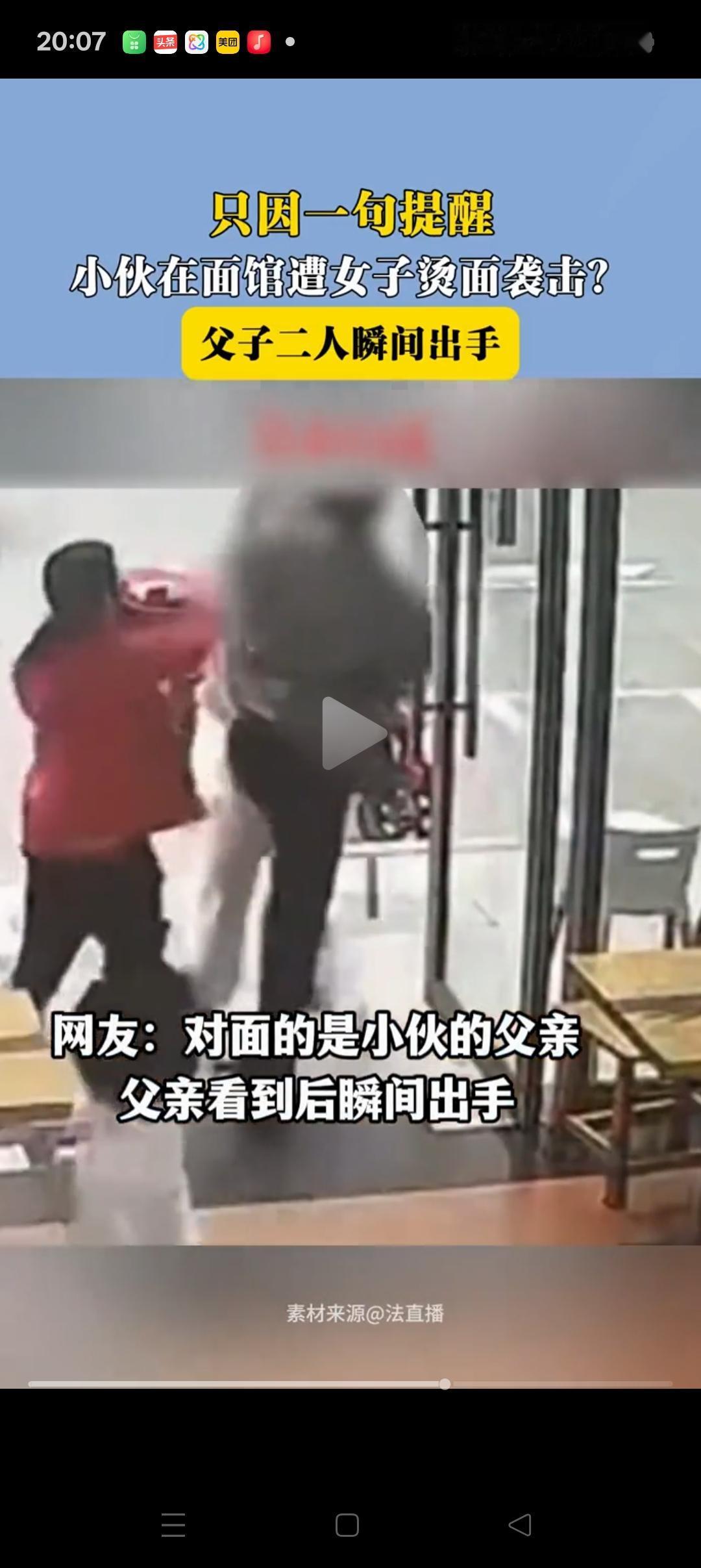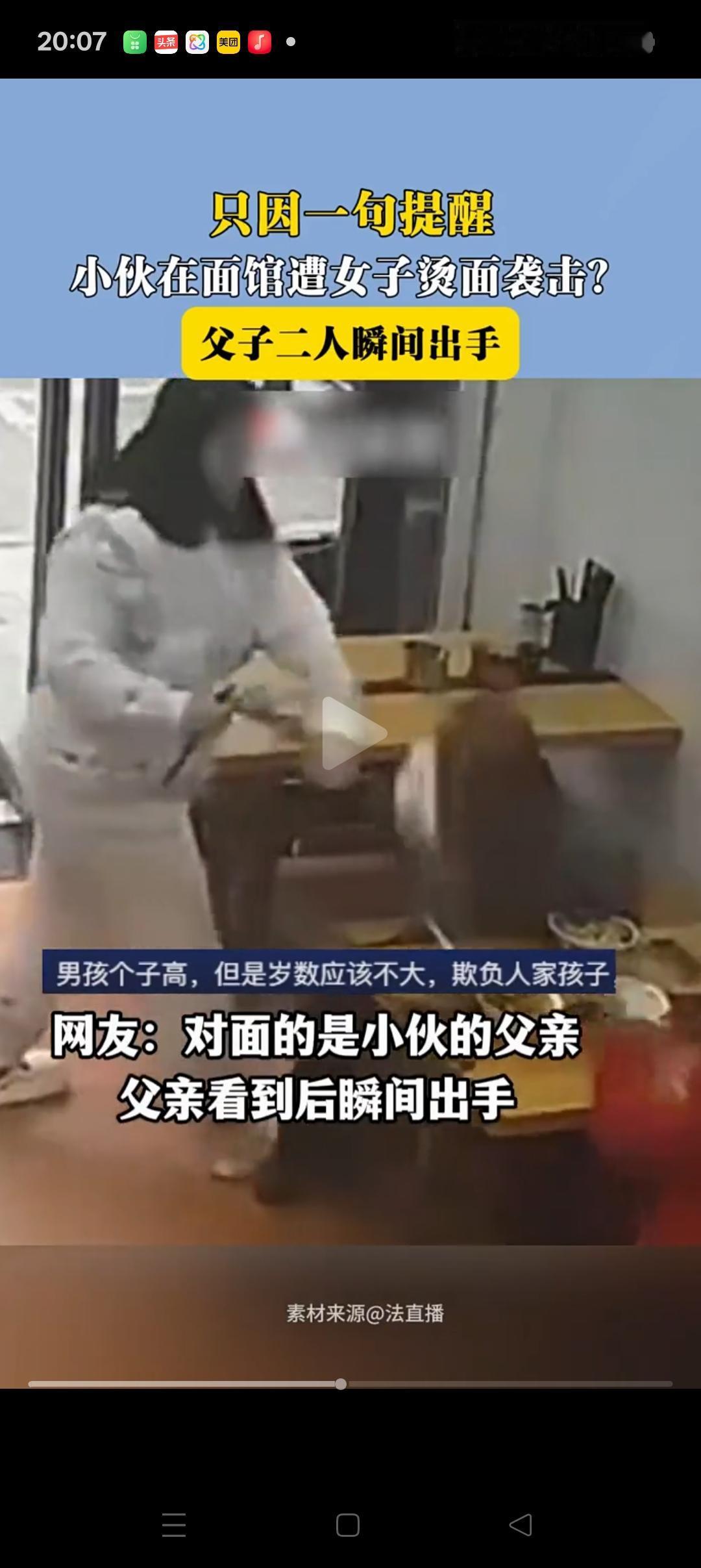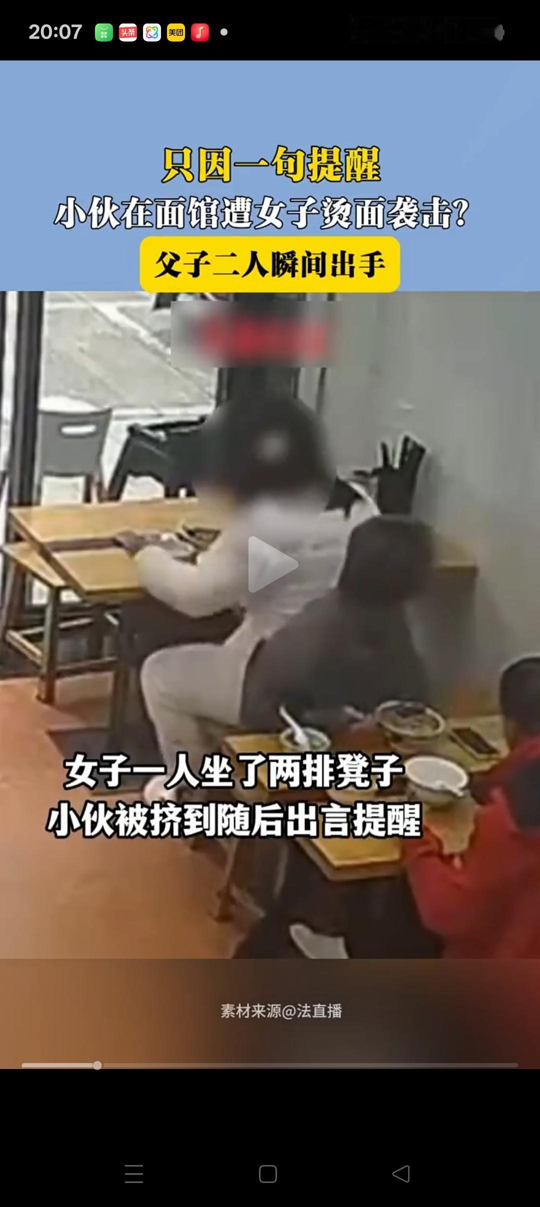 “谁给你的勇气?”浙江,一小伙因提醒女子不要占两个位置,女子把面直接扣在了他的头上。不料,女子这个动作让他们父子同心,没有一丝犹豫的和她扭打在一起。最后小仙女骂骂咧咧的离开了[偷笑] 看了视频,这女的因为比较胖,所以把位置往后挪了点,导致后面桌子很挤,男的都把脚伸在桌子底下了。 本来她碰到别人,道个歉就好了!没想到,她还主动骂人,不解气还把面扣在人家头上。也难怪小伙爸爸忍不住上去帮忙,不给她跑的机会。。 这位美女估计也是家里横惯了,遇到两个男人也敢先动手,真的虎[捂脸][捂脸]。。