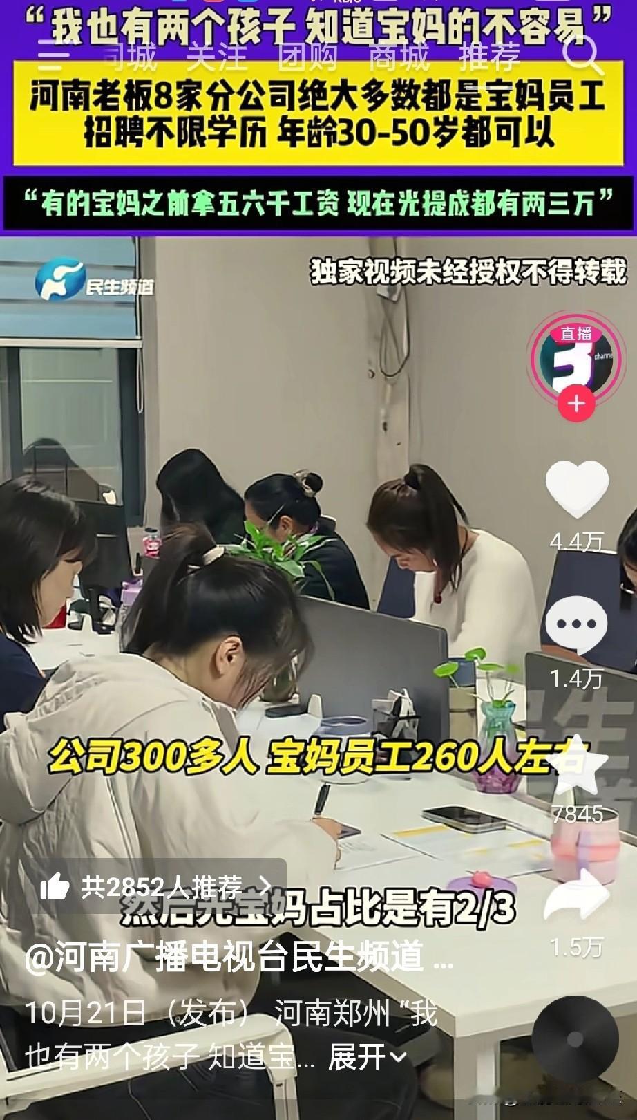 见过每月休10天、还能弹性上下班的工作吗?河南一位冻品老板为宝妈们提供了这样的"神仙岗位"。他的公司里,超过260名宝妈员工中,有人月薪高达5万元。这位老板坚持"挣100万给员工分85万",因为他自己也有孩子,深知宝妈的不易。 这不仅仅是高薪那么简单,它打破了"带娃和工作不可兼得"的困境。弹性工作制让宝妈们接送孩子后"晚来早走",用业绩证明:当企业给予信任,这群看似"时间碎片化"的群体,反而能爆发出惊人创造力。 类似的"妈妈岗"正在多地出现,说明支持女性就业不是施舍,而是对人才资源的优化。这种双赢模式值得更多企业借鉴——员工幸福感提升,企业也获得了更稳定、更有动力的团队。 你怎么看这种弹性工作制?如果是你,会为这样的工作放弃传统岗位吗?欢迎在评论区分享你的看法!