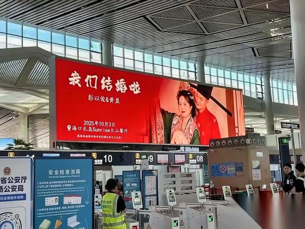 国庆海口机场火了—— 88块屏幕全在播同一份“广告”。 不是促销不是电影,是对新人的婚礼邀请函! 谁能想到机场大屏还能这么用?新娘黄女士是海南人,老公是广东仔,结婚那天亲友全从美兰落地——“这是大家来喝喜酒的第一站啊,想让他们刚下飞机就撞进我们的喜糖里。”连机场都新鲜:“头一回接婚礼单!”直接给了超划算的套餐,88块屏轮播8天,把“我们要结婚啦”滚成了机场里的“流动红双喜”。 更暖的是,他们特意留了两桌给陌生宾客——“要是有人看了大屏愿意绕远路来,那肯定是带着真心的,礼钱随便,就想请他喝杯喜酒。”虽然当天没人来,但这份心意比任何鲜花都戳人:不是要“装高调”,是想把“此刻认定彼此的真心”,摊开给每一个路过的人看。 其实哪是张扬啊?不过是把“亲友相遇的起点”,变成了“幸福的扩音器”。现在好多人说“婚礼没必要搞花样”,但搞花样的不是钱,是“我想把每一丝甜都塞给你”的热乎劲——比朋友圈的九宫格更实在,比酒店的豪华布置更有温度。 如果是你,会为这种“广而告之的幸福”心动吗?或者你见过更戳人的婚礼小心思?评论区聊聊,我先去给这对新人点个“想蹭喜糖”的赞~