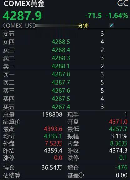 期货方面,COMEX黄金期货亦出现回调。截至记者发稿,COMEX黄金期货日内跌1.64%,报4287.9美元/盎司,盘中最高触及4393.6美元/盎司,最低则跌至4257.7美元/盎司。