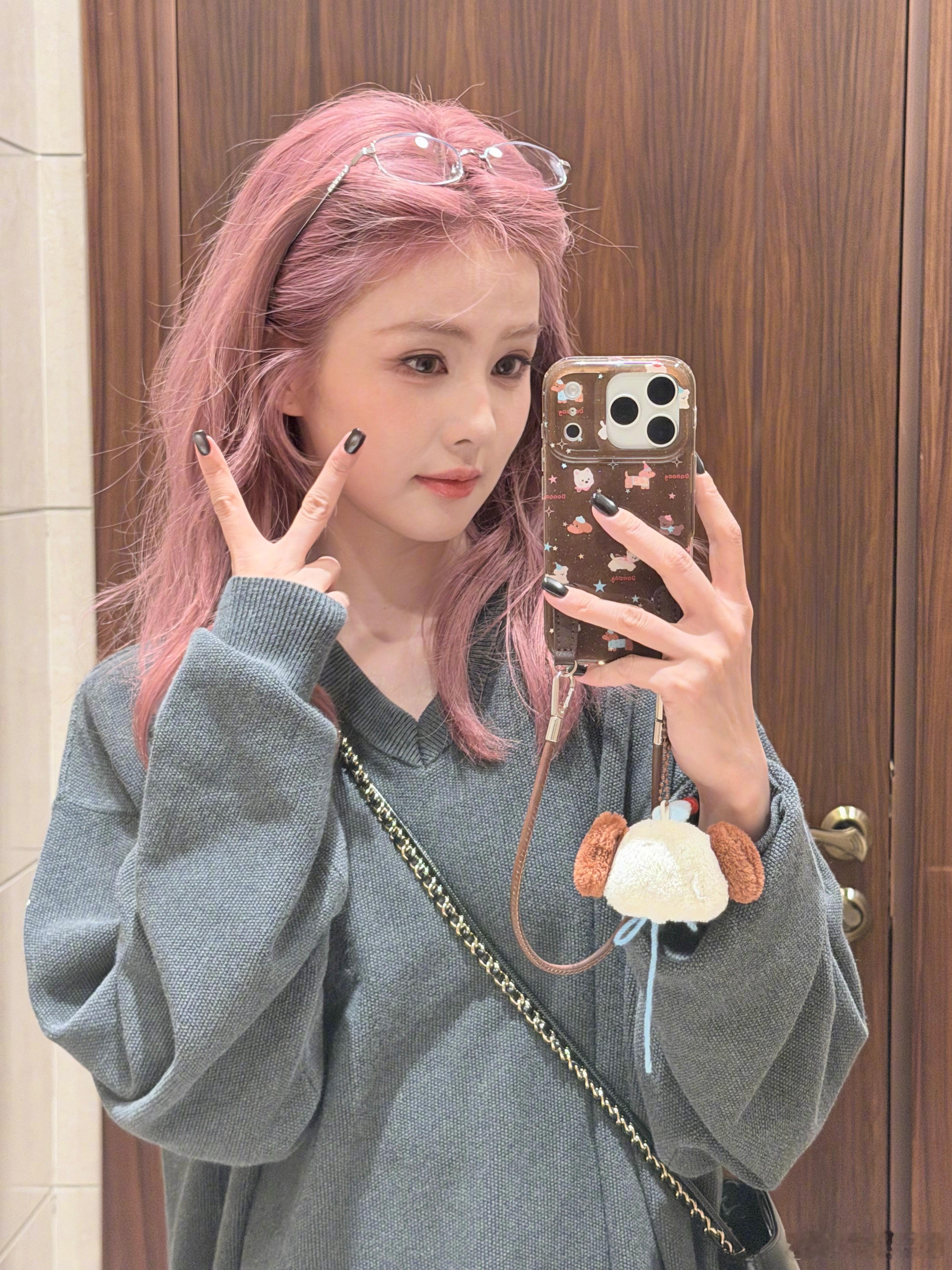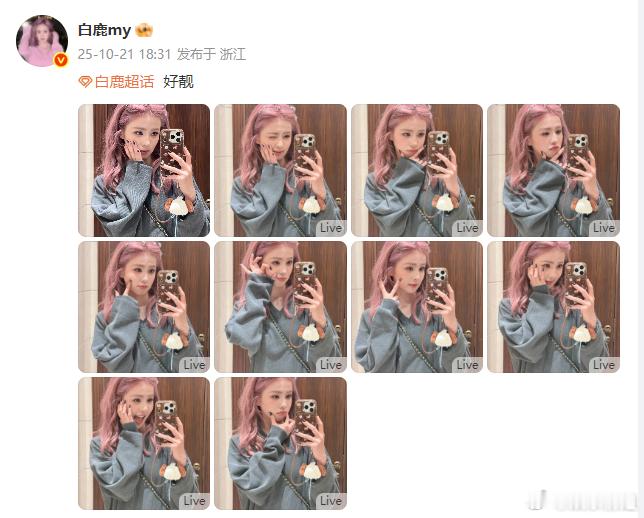 白鹿自夸好靓 白鹿晒粉发对镜自拍,配文“好靓”。啊啊啊捉到一只小萌鹿,怎么那么可爱~美到我心坎上了[爱慕][爱慕]