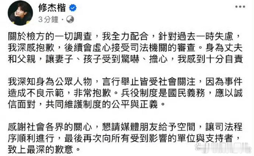 21日,修杰楷就逃兵役发长文道歉,称将全力配合检方的一切调查,“身为丈夫和父亲,