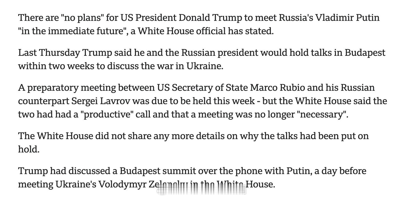 一位白宫官员表示,Rubio已与俄罗斯外长拉夫罗夫进行了一次“富有成效”的通话,因此不需要再举行额外的面对面会议,而且川普近期也没有与普京会面的计划。