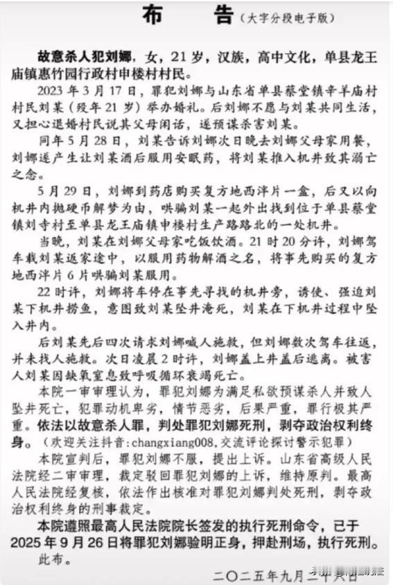 “离婚就是了,至于害命吗?”山东菏泽,女子刚结婚2个月,就开始对丈夫各种不满,偏偏丈夫待她十分温柔体贴,这让她一时找不到退婚的借口。直到这天女子和丈夫回娘家吃酒,眼见丈夫喝大了,女子拿出安眠药哄对方服下,又连哄带骗的让他大半夜下机井捞鱼,最终导致丈夫溺亡,最终女子也得到了应有的处罚。 闽南网十月二十一号报道了这则女子因对丈夫没感觉,就设计淹死丈夫,最终女子也被执行死 刑的新闻,事情的经过是这样的。 时间拉回到二三年的三月十七号,时年21岁的小丽(化名)经亲戚介绍,和同村的小刘(化名)结婚了。 初为人妇的小丽刚开始还是挺有新鲜感的,加上丈夫也是一个村的,刚开始相处起来还挺融洽的,可这时间才过去了2个月,小丽的心情完全就变了。 之前小刘的老实本分,在现在的小丽看来就是木讷无趣,之前的好脾气,现在看来就是唯唯诺诺,甚至到了小丽一看到丈夫就来气的程度。 现在小丽基本不和丈夫说话了,对他的嘘寒问暖也当做耳旁风,每天除了刷手机就是睡觉,整个人也越来越没精神了。 一想到这样的日子还要过上几十年,小丽都失眠了好几次,可每次到嘴边的离婚的话,却怎么也说不出口。 原来小丽也明白就是自己作,毕竟在外人看来,丈夫对自己那真是宠到了天上,要想吃什么、想要买什么,丈夫都会尽量满足,对于自己的小脾气更是宽容。 不仅如此,丈夫在村里的口碑也十分好,如果这个时候提出离婚,那村民的唾沫星子能将自己和父母淹死。 就在小丽准备认命的时候,转机出现了。 原来是娘家人邀请他们小两口回去吃酒,此时小丽的心中突然冒出了一个可怕的想法。 今天的小丽表现得很热情,在饭桌上一个劲的劝丈夫和岳父喝酒,让他一定将岳父陪好,到时候回去自己开车就行。 见老婆大人发话了,小刘没有含糊,使尽浑身解数,很快两人就喝大了。 回去的路上小丽开车,她却故意将车开到一个偏僻的小道,停好车后将提前准备的安眠药拿出来,然后劝丈夫这是解酒药,吃了就不头疼了。 小刘此时已经喝的晕头转向,也没多想接过安眠药就吞了下去。 果然,吃完安眠药的小刘只觉得困意袭来,整个人很快安静了下来。 看到时机已到,小丽将车开到事先找好的机井旁,随后摇醒丈夫,让他下去逮几条鱼尝尝。 小刘艰难的睁开眼,迷迷糊糊道:“大晚上的捞什么鱼呀,想吃我明天去给你买,咱们先回家吧...” 小丽自然不肯,抱着丈夫佯装生气,表示现在就要吃鱼,不然就不回去。 没办法爱妻心切的丈夫只能顶着头晕下到井里,果然没走两步就滑倒摔到水里了。 丈夫连忙朝井边的小丽求救,可小丽却转头开车离开了。 丈夫以为是妻子吓傻了,是开车出去找人求救的,就在井里等着,直到小丽四次返回,都发现还在水里坚持着,最终她一咬牙将将井盖盖好,随后驾车离开。 就这样,小刘最终因缺氧窒息,导致呼吸循环衰竭死亡。 那么,从法律角度,如何判定小丽的行为呢? 根据《刑法》第二百三十二条规定:故意杀人的,处死刑、无期徒刑或者十年以上有期徒刑;情节较轻的,处三年以上十年以下有期徒刑。 小丽作为具备刑事责任能力的自然人,故意将丈夫带到机井旁,随后哄骗对方吃下安眠药,又让其到井里抓鱼,主观上有非法剥夺丈夫生命的故鱼,手段极其恶劣,其行为构成了故意杀人罪。 最终,一审以故意杀人罪,判处小丽死刑,并剥夺政治权利终身。 小丽不服,提起了上诉。 二审认为一审事实清楚,事实认定明确,驳回了小丽的全部诉求,维持原判 经最高院复核,菏泽市中院于二五年九月二十六日将小丽验明正身,随后押赴刑场执行死刑。 那么,对于这事你怎么看呢?评论区见!
