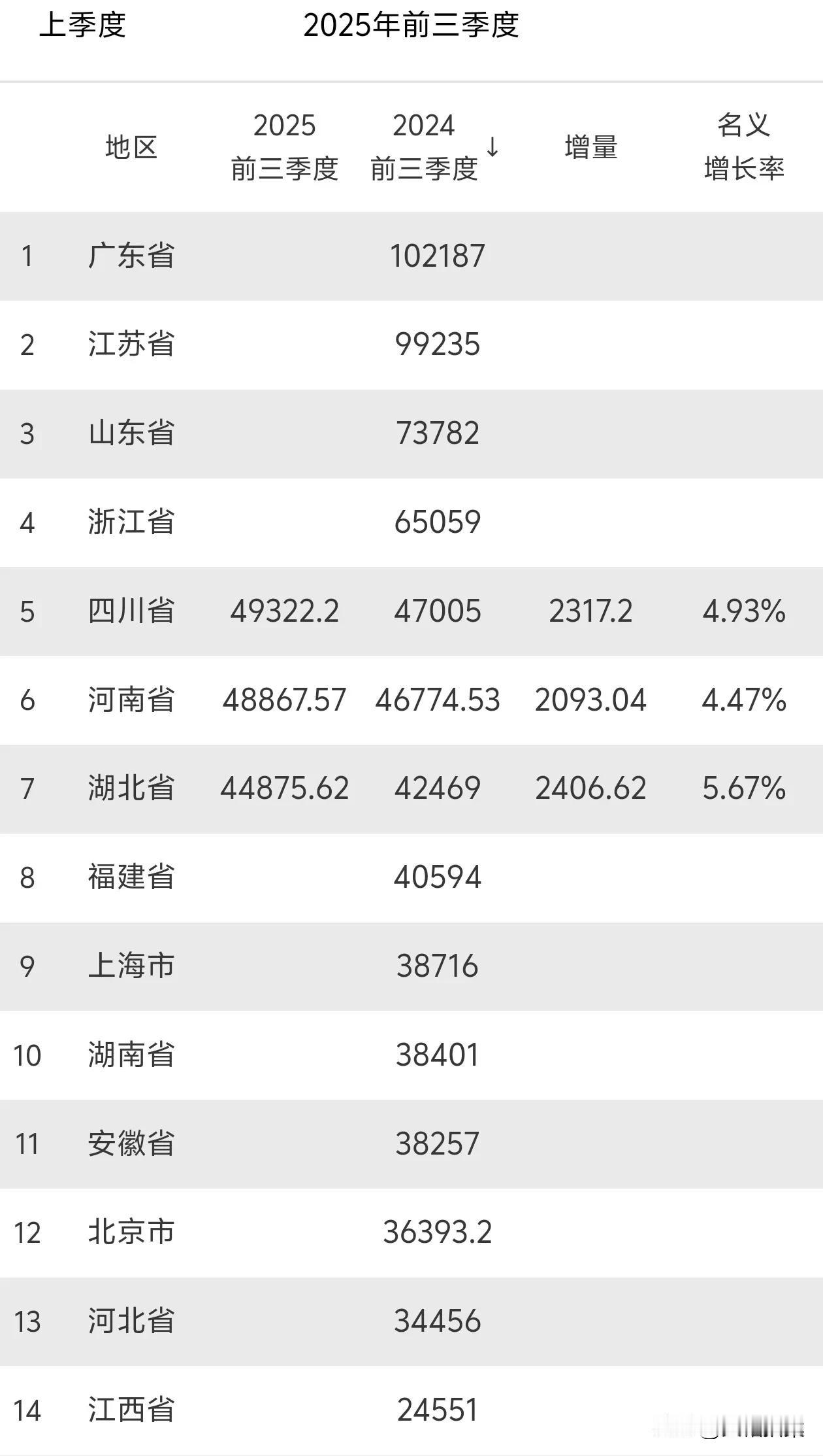 四川、河南、湖北三省率先公布了前三季度GDP,湖北依然是势头最猛的那个,增速6%,超过了大盘平均水平。增量达到了2406.62亿,全年突破6.4万亿应该无悬念了。 四川与河南的表现,虽然不如湖北亮眼,但是也很不错了。尤其是河南能够回正,本身就是巨大进步。河南与四川的差距很小,正常努力一下,反超四川也问题不大。各省GDP排行 各省市经济增速 四川经济总量 河南各市GDP 湖北城市经济