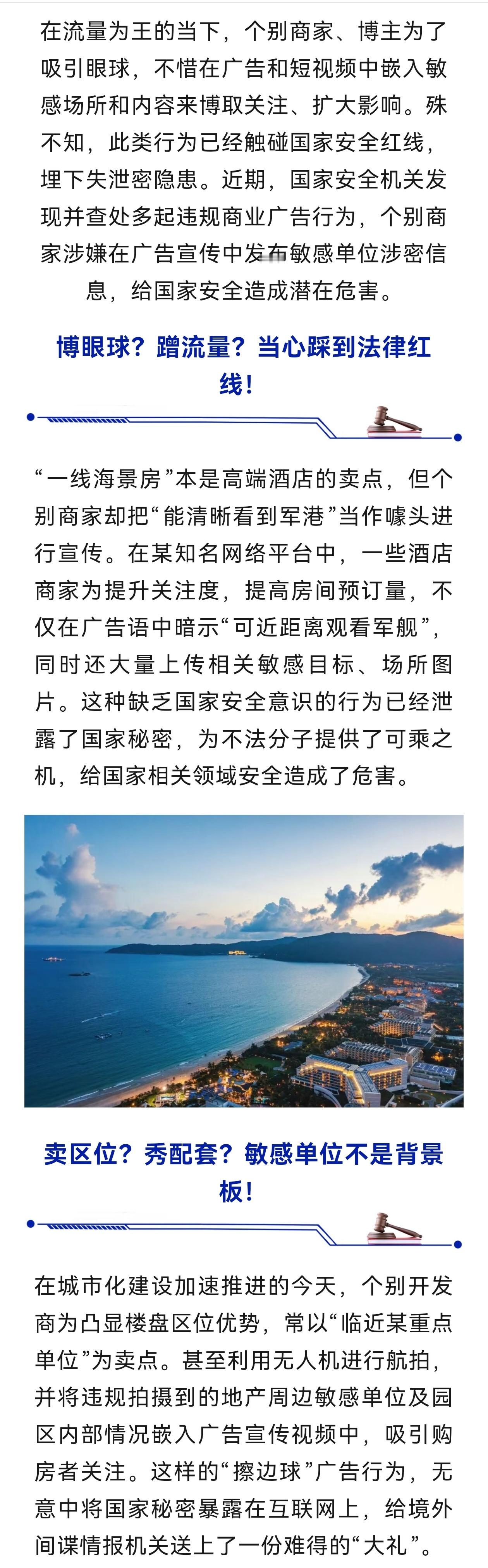 商家广告泄露国家秘密“一线海景房”本是高端酒店的卖点,但个别商家却把“能清晰看到