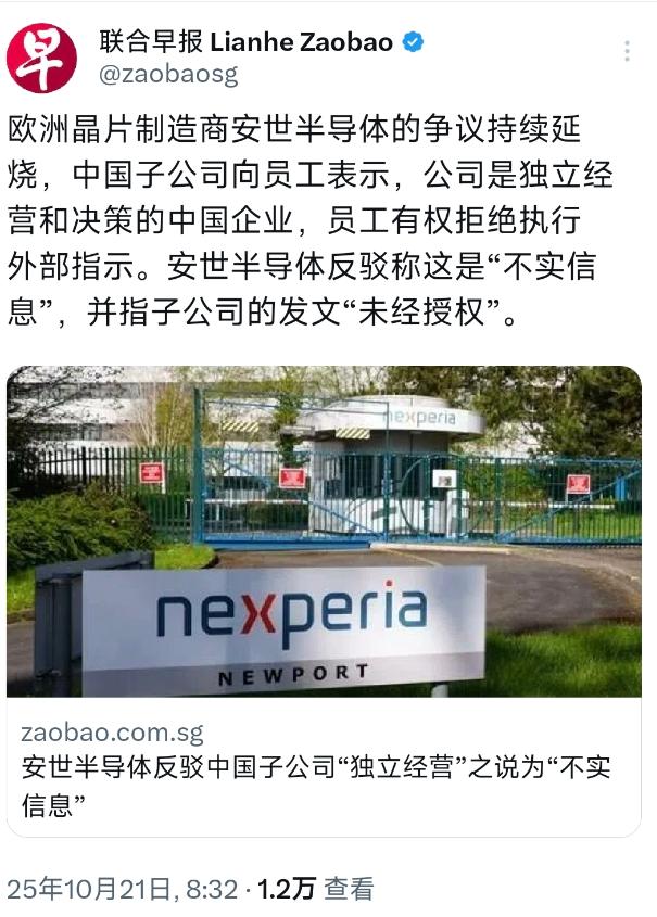 新加坡联合早报今天(10月21日)报道:“欧洲芯片制造商安世半导体的争议持续延烧,中国子公司向员工表示,公司是独立经营和决策的中国企业,员工有权拒绝执行外部指示。安世半导体反驳称这是‘不实信息’,并指子公司的发文‘未经授权’。 这场矛盾的根源要从一个月前说起。9 月底,荷兰经济事务部突然出手,从中国母公司闻泰科技手中接管了安世半导体,第二天荷兰法院就暂停了中籍 CEO 张学政的职务,把闻泰持有的大部分股份托管给了第三方。 而这一切的幕后推手,正是美国不断升级的施压 —— 荷兰法院公布的文件显示,美方 6 月就明确要求安世更换中国籍 CEO,否则就会被列入 “实体清单”,荷兰政府为了避免被牵连,最终选择了妥协。 中国子公司的强硬回应并非突然发难。10 月 18 日下午,安世中国就在官微发布致员工信,字里行间都是底气:国内公司是独立的中国企业,法定代表人说了算,员工只需要听国内指示,其他外部指令哪怕通过办公系统发来,都有权拒绝。 更实在的是,信里特意强调薪资福利全由国内公司发放,和荷兰总部没关系,这等于给近万名中国员工吃了颗定心丸。到 10 月 19 日,安世中国再次发文重申立场,生产经营一切正常,还在加紧拉通国内供应链应对可能的断供风险。 安世总部的反驳显得有些仓促,只笼统地说子公司发文 “未经授权” 是 “不实信息”,却没具体回应中国子公司提出的法律依据和运营细节。 这种模糊表态背后,是总部面临的两难处境:既要配合美荷的管控要求,又不敢真的切断中国业务 —— 要知道安世东莞工厂是全球最大的小信号组件工厂,年产量超过 500 亿件,占全球出货量的 70%,中国市场更是贡献了公司近一半的营收。 这场内讧最着急的是全球汽车行业。安世可不是普通芯片厂,它的小信号二极管、ESD 保护器件全球出货量第一,车规级 Power MOS 排名第二,博世、大众这些巨头都依赖它的供应。 欧洲汽车制造商协会 10 月 16 日就发出警告,安世芯片库存只剩几周,新供应商认证要花数月,一旦断供欧洲车企可能集体停产。美国汽车创新联盟也紧跟着施压,担心本土生产受到波及,毕竟汽车芯片的溢出效应能影响整个制造业。 中方早已明确表态反对这种干预。商务部 10 月 16 日就指出,荷兰是在执行美国的 “穿透规则”,用行政手段插手企业事务,既违反契约精神又破坏供应链。 外交部第二天再次发声,要求有关国家纠正错误做法,中方会坚决维护企业合法权益。闻泰科技这边也没坐以待毙,10 月 15 日如期通过员工持股计划,高管还透露要把国内产能稳定在 80%,争取将中国市场份额提升到 80%,显然在做长期应对准备。 现在的安世就像被撕扯的 “夹心饼干”:荷兰总部握着股权托管权,美国盯着技术管控,中国子公司攥着生产和市场命脉,三方的拉扯让全球供应链悬在半空。 中国子公司和总部的公开对立,本质上是控制权与运营权的激烈碰撞,而这场碰撞的结果,不仅决定着一家芯片巨头的命运,更可能改写全球半导体产业的布局逻辑。 信源:联合早报
