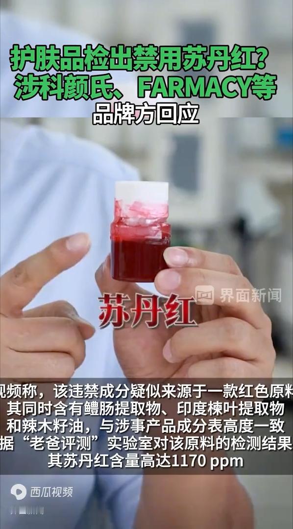化妆品中也敢违法添加苏丹红?这不是害人嘛! 10月19日,“老爸测评”在多款化妆品中测出苏丹红,极为令人震惊,毕竟苏丹红对人体具有基因毒性和潜在的致癌风险。为查明真相,去翻了成分表,原来它们都用了"鳢肠提取物、印度楝叶提取物和辣木籽油"这一原料,它是一种红色溶液,里面人为添加苏丹红。现在到底有几种化妆品添加了这一含苏丹红的原料,犹未可知,反正红色的化妆品要小心就是了。