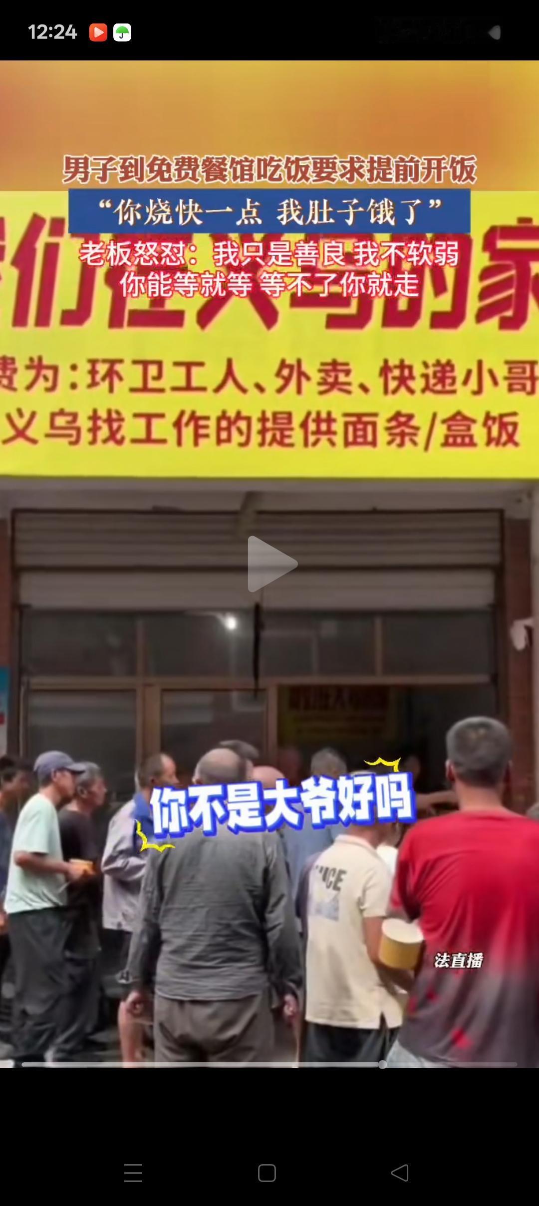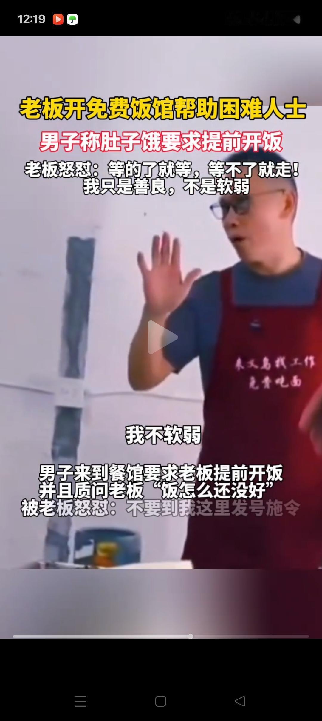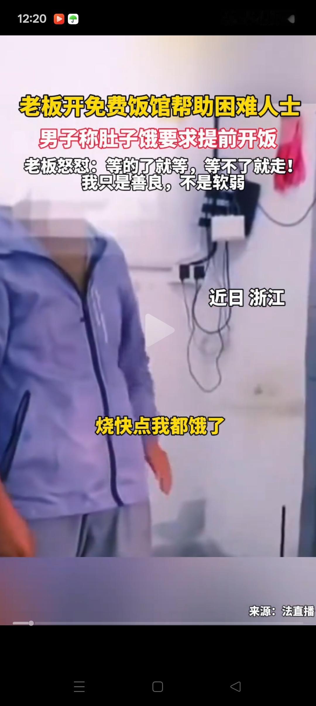 “怼的好”,义乌,一大爷到餐馆免费吃饭,还要求老板能不能搞快一点,说他饿了!老板也是不惯着,怼他“我只是善良,但不是软弱”。 老板提供免费的饭菜本是一件好事,是给真正有需要的人,而不是肚子饿了就想着来吃一顿免费的。而且当时的时间才10点钟,就要求吃饭,未免也太早了吧。 真心建议老板不要免费,可以收个成本价。而且菜也不要太丰富,简单一些就好,弄些馒头,青菜,稀饭即可。 只要真正有需要的人,都会吃的很香,也会感恩。也可以让一些只是饿了,占便宜的人远离。 这个老板怼的好,想吃免费的,就按我的规矩来,有理有据[赞][赞]