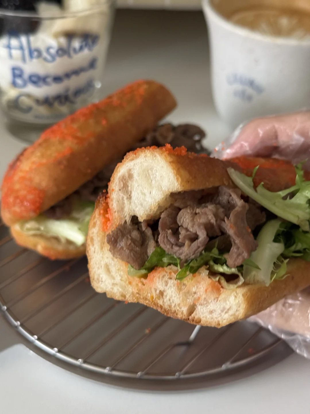 𝑴𝒐𝒓𝒏𝒊𝒏𝒈☁️ 单吃这个明太子法棍有一点点腥🤏 炒了点肥牛夹在里面🥖 - 这一个三明治下去还挺管饱的