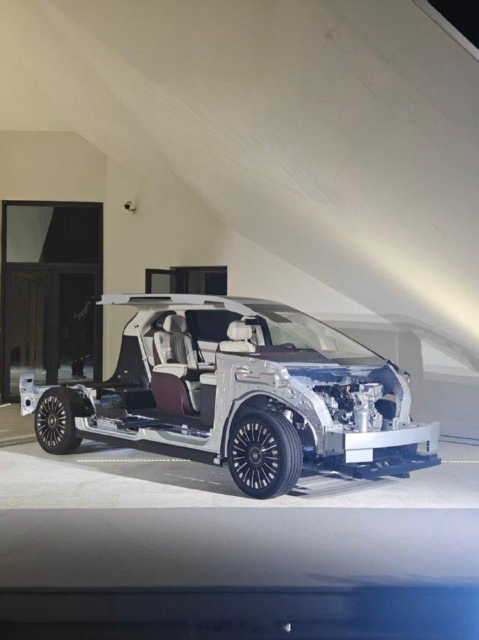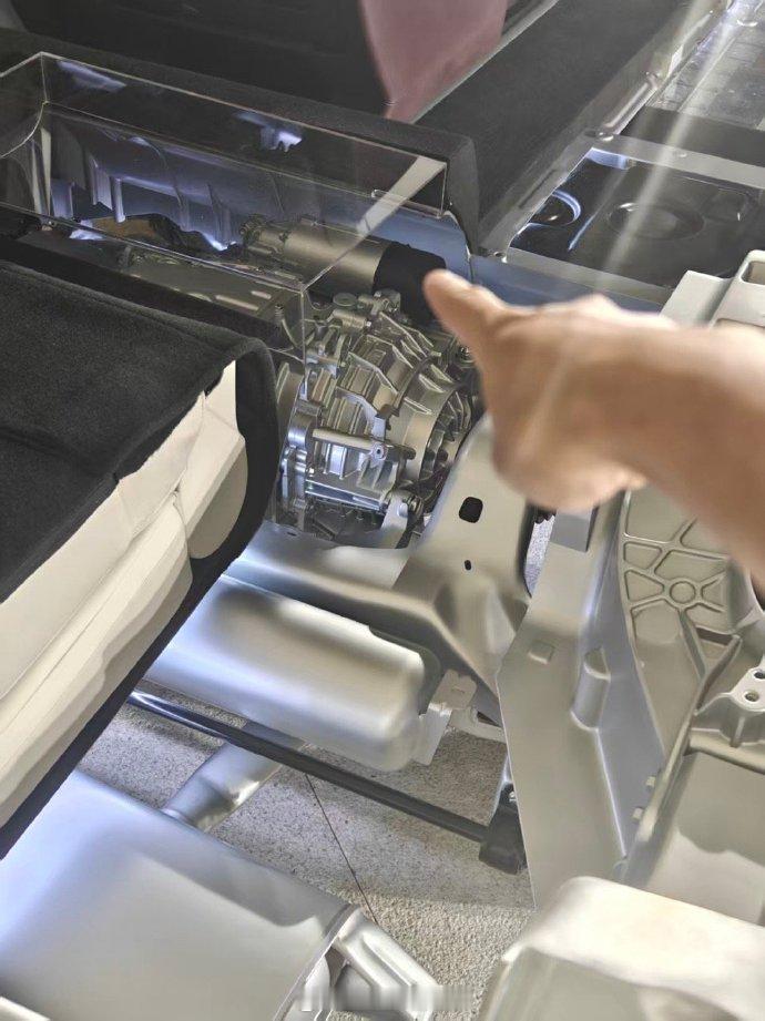 “切割车”最直观的展示出:增加发动机和油箱的前提下,仍然保留了后轮转向装置,而且第三排座椅似乎和纯电版一致